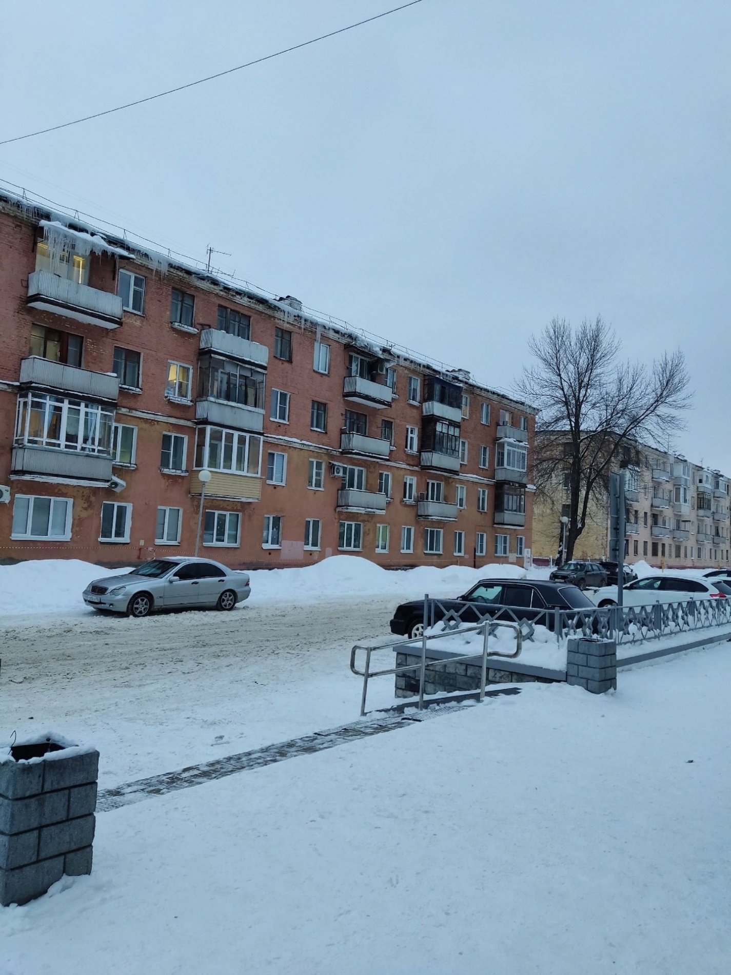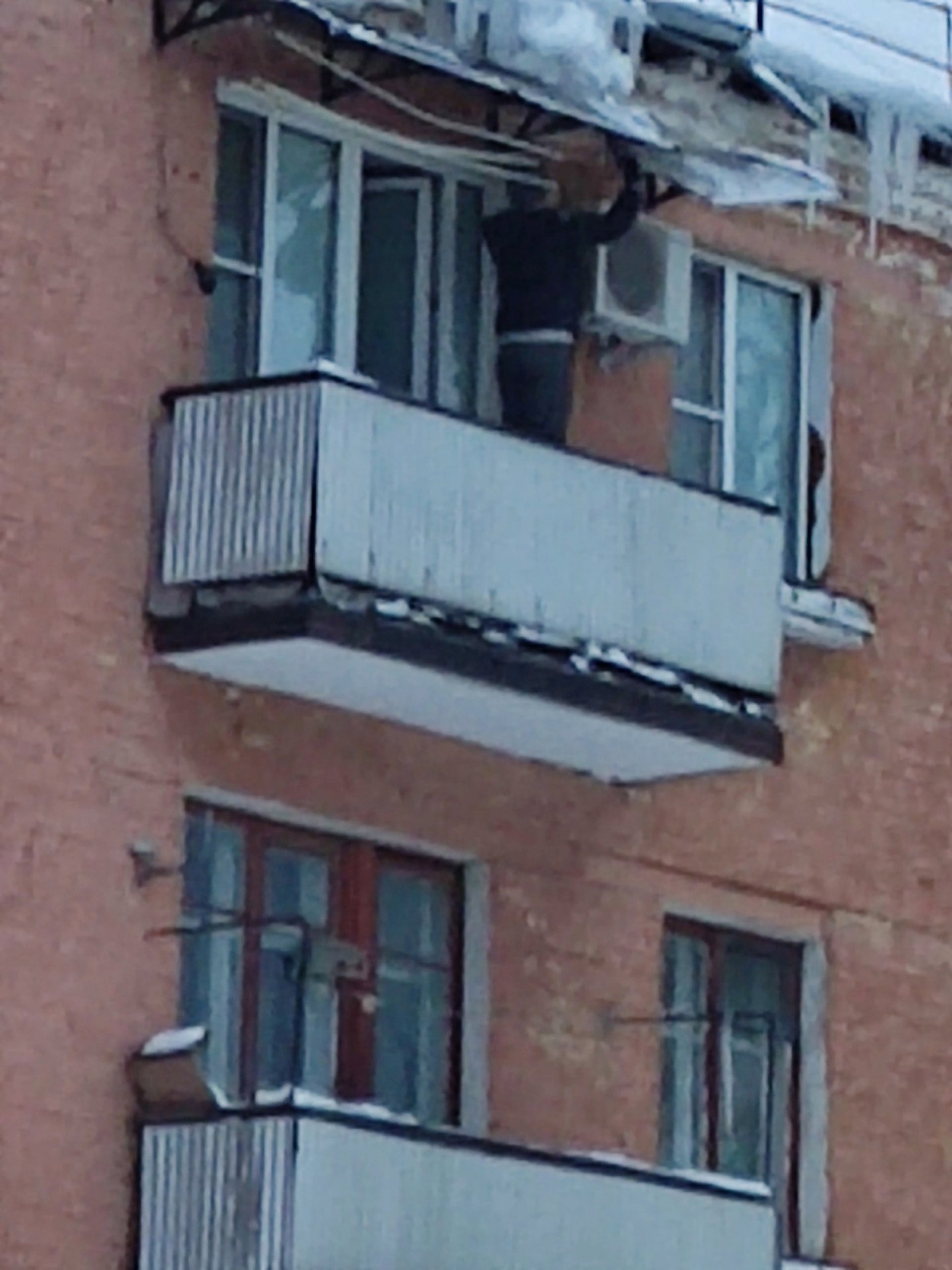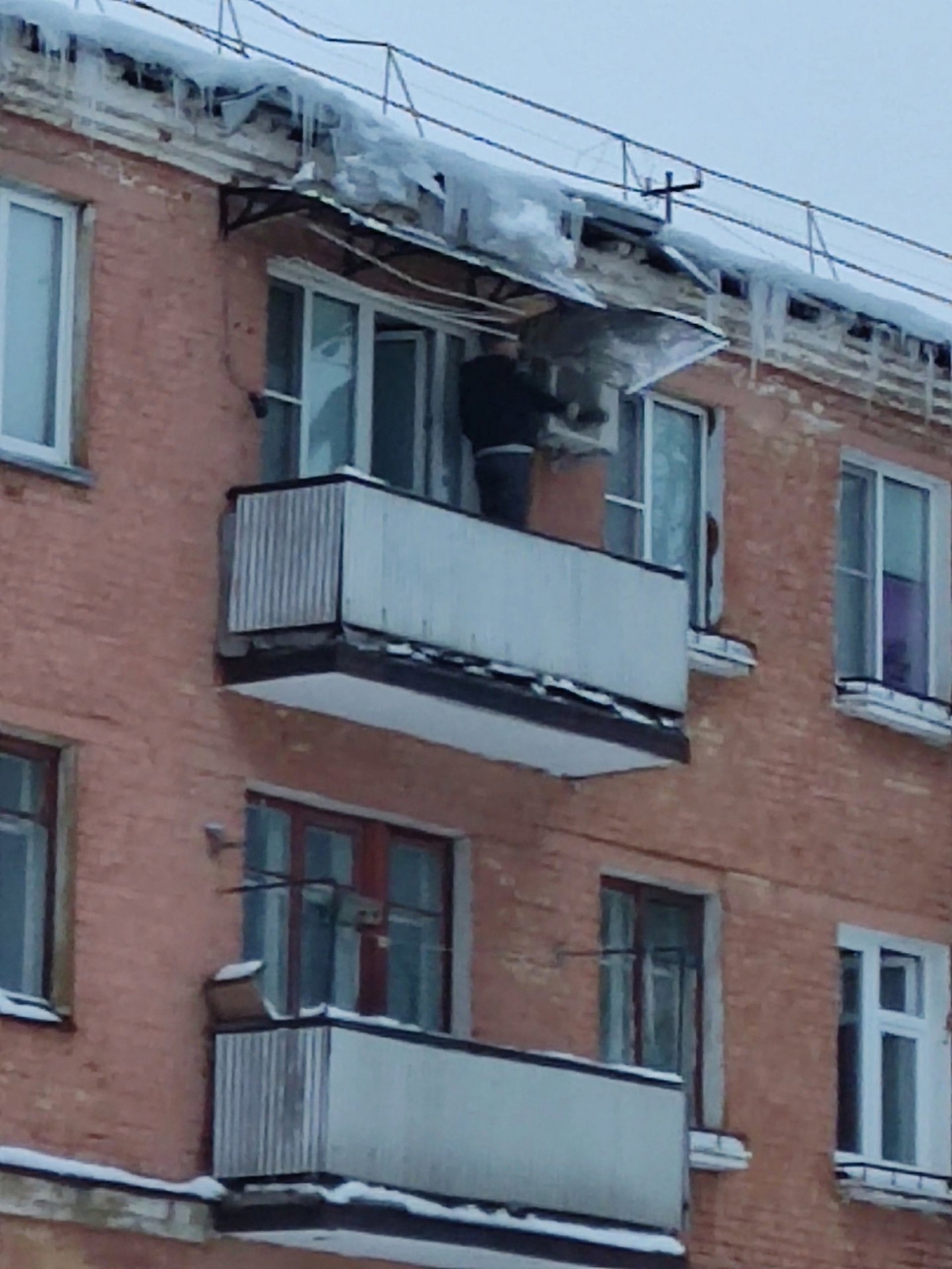 Не дождавшись действий управляющей компании, мужчина около молодежного центра очищал крышу своего балкона от сосулек и глыб льда. К сожалению, в попытках отломать лёд горячей водой и постукивая по обратной стороне крыши — сломал её (пластиковая похоже была). Мужчина предупреждал всех прохожих (кричал, что может упасть).