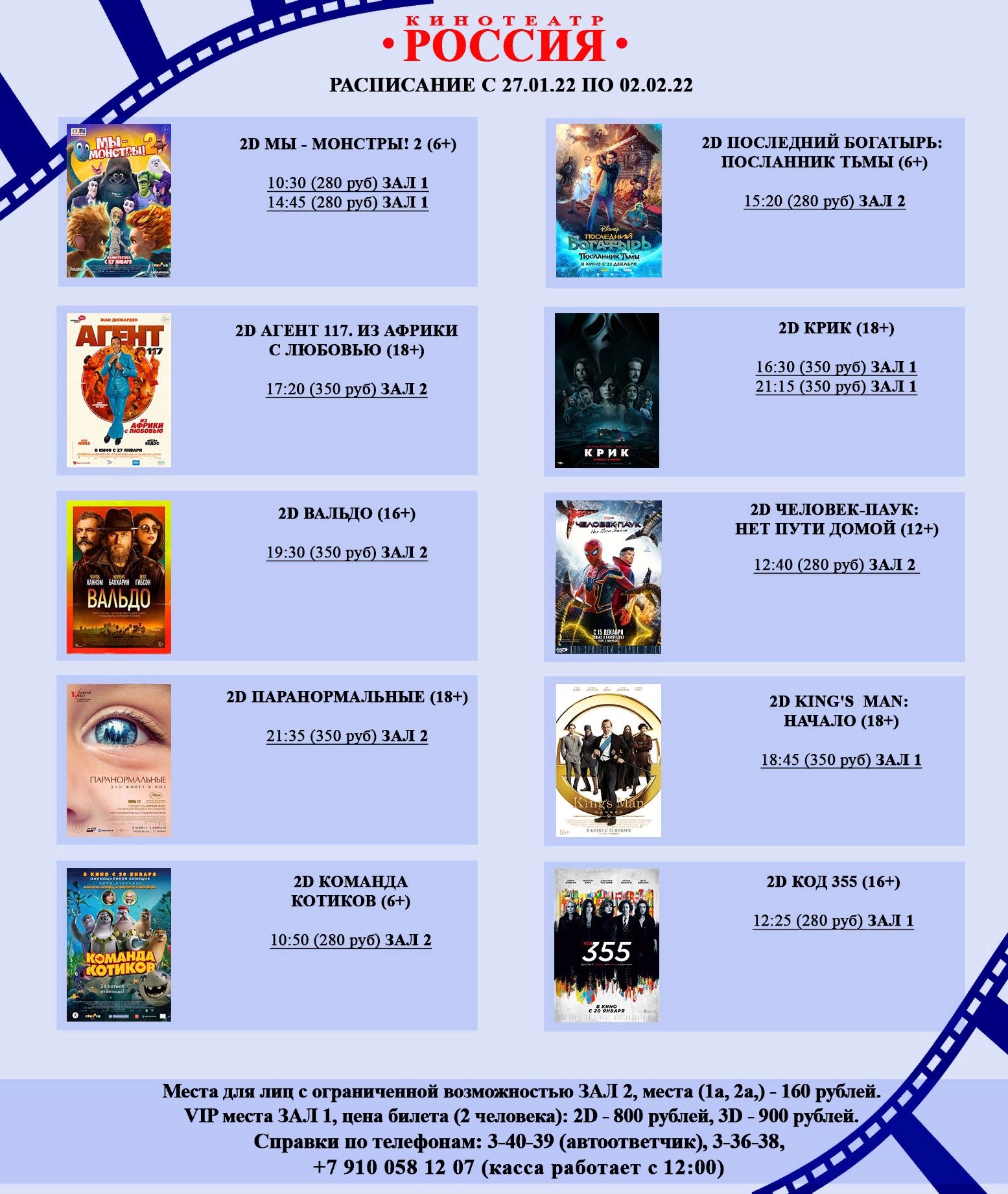 Афиша кинотеатра «Россия» с 27 января по 2 февраля