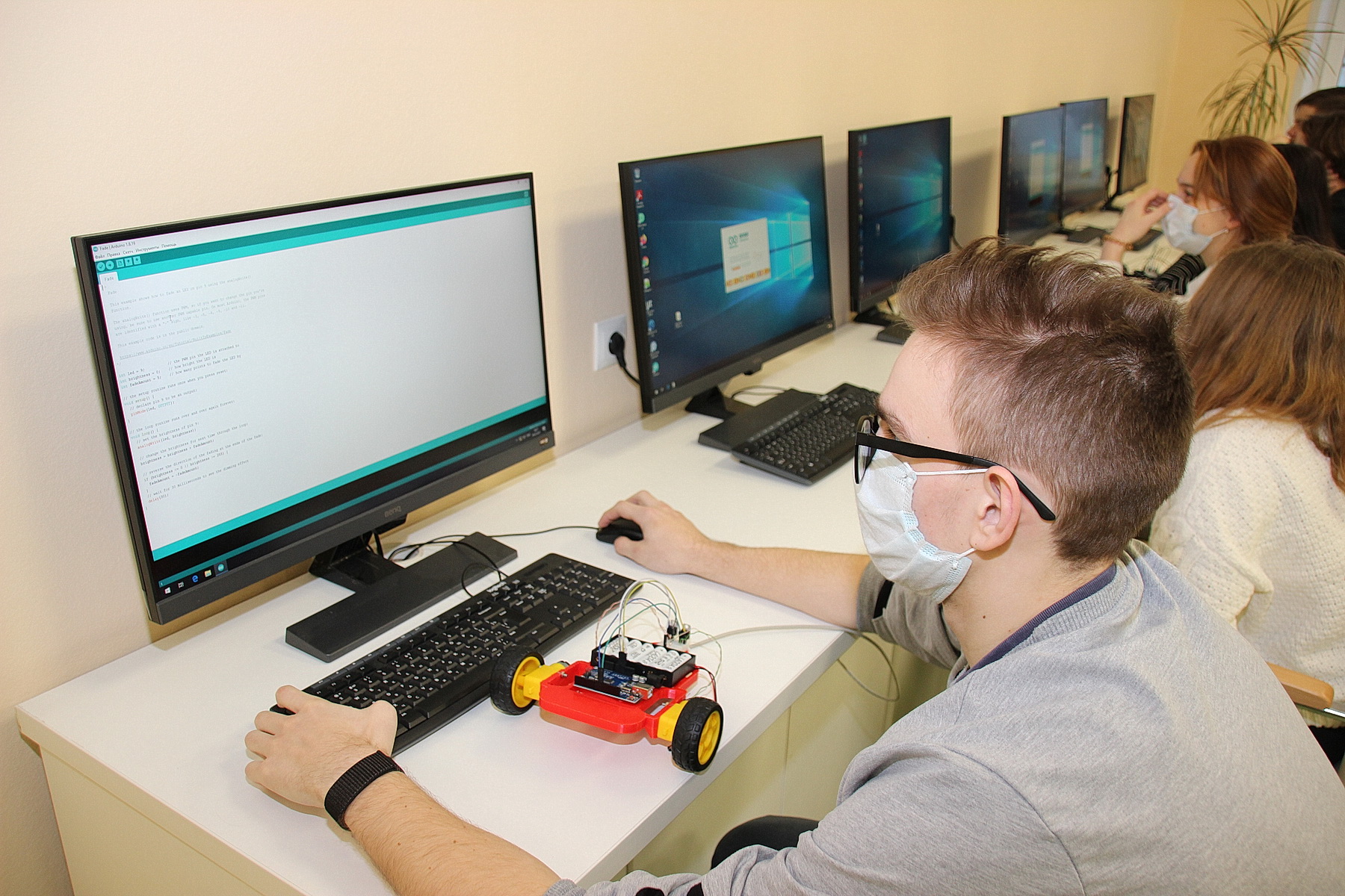 9 февраля ученики 9−10 классов школы № 17 занимались робототехникой и программированием в рамках цикла «Школа — вуз — предприятие» («ШВП») городского проекта «Профтенд». С роботами на платформе Arduino они уже «общались» в январе, а теперь — новая задача: изменить программу движения робота таким образом, чтобы «машина» прошла испытания на условном полигоне. Надо отдать должное школьникам — они упорно шли к поставленной цели. Да, не всё сразу получилось, но через полтора часа кропотливой работы практически все с радостью наблюдали, как их конструкция перемещается по заданному маршруту.