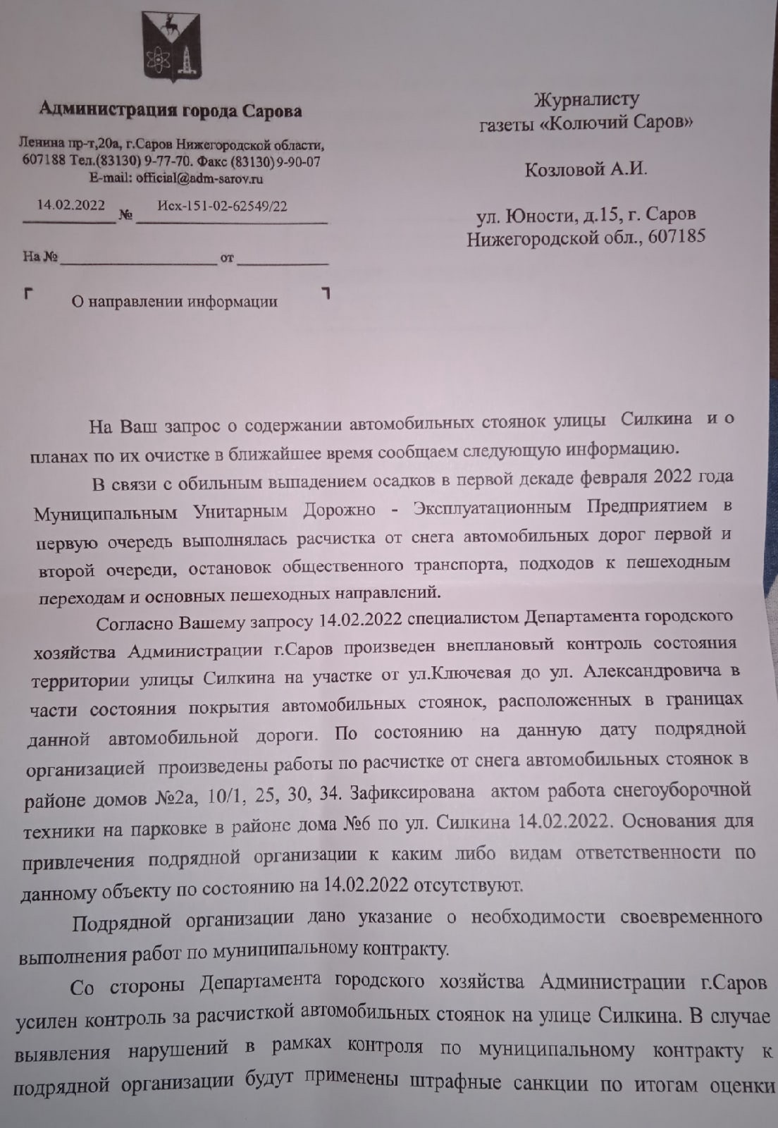 Пришёл ответ на запрос про чистку парковки на Силкина