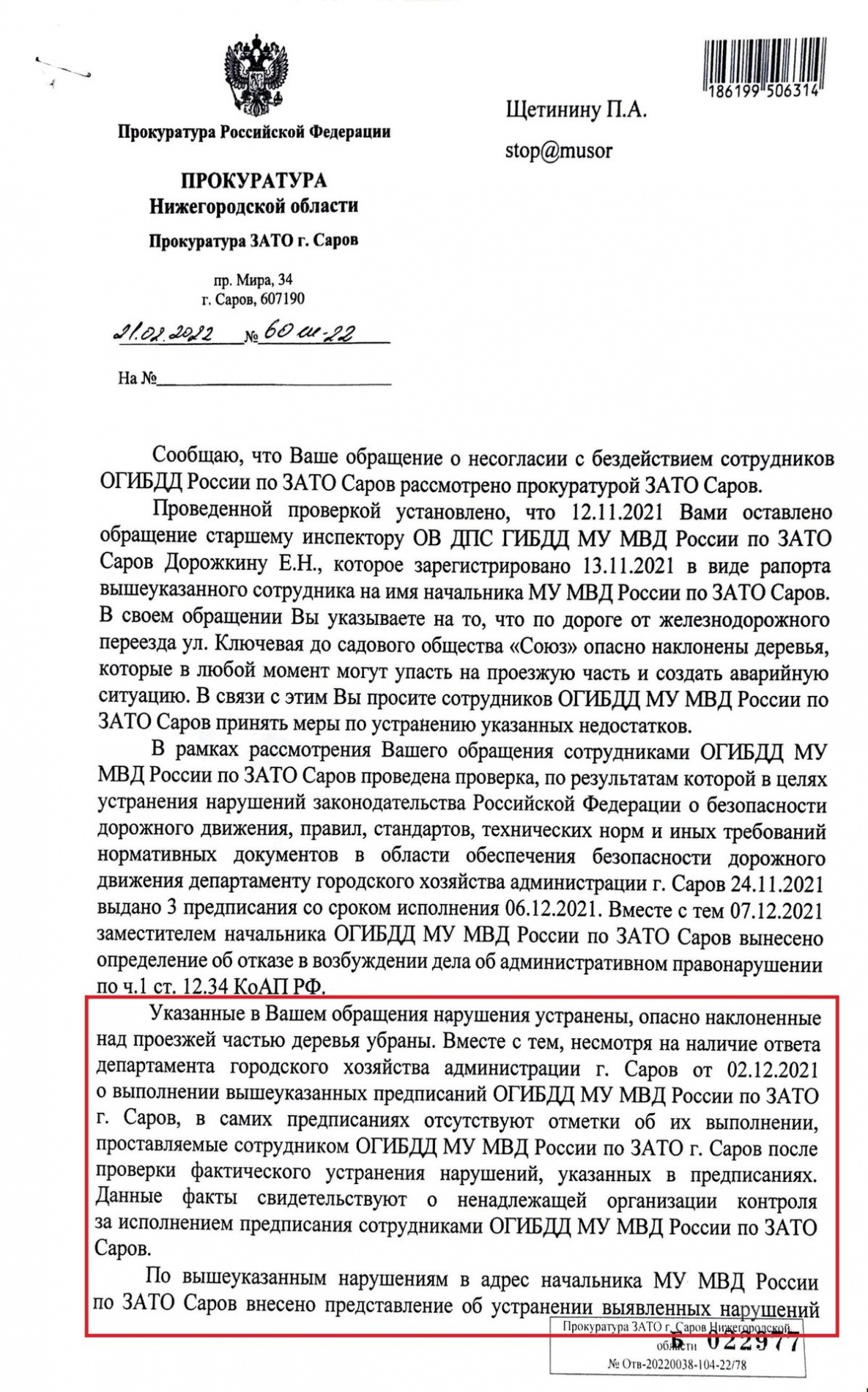 Ранее он уже писал об этой проблеме в ДГХ администрации и получил неоднозначный ответ. Стал разбираться дальше и написал в прокуратуру. Ответ ДГХ был успешно обжалован. Опасно наклоненные над проезжей частью деревья убраны.