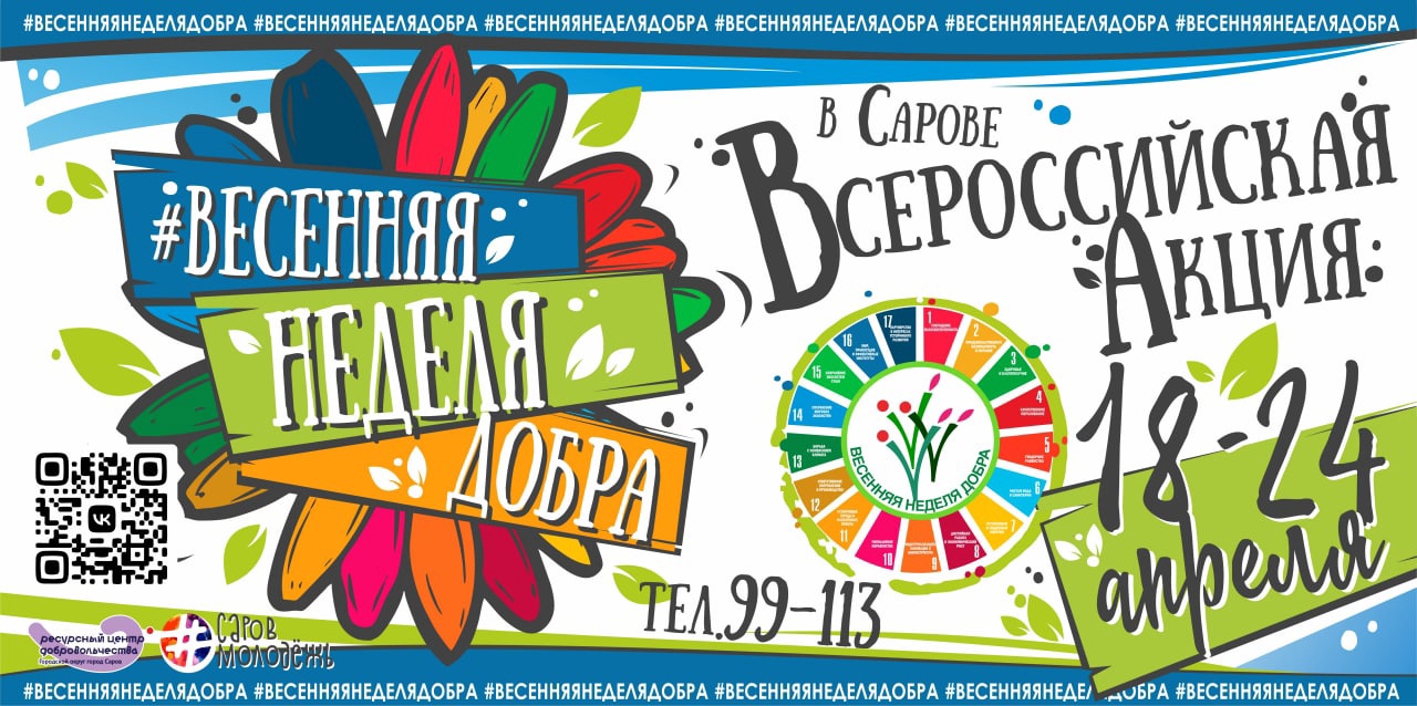 С 18 по 24 апреля в Сарове пройдёт Всероссийская акция «Весенняя неделя добра». Это будут благотворительные акции, встречи, мастер-классы, субботники, квесты и другие события в сфере добровольчества. Ежегодно в мероприятиях акции принимают участие воспитанники детских садов, школьники, студенты, представители волонтерских движений города.