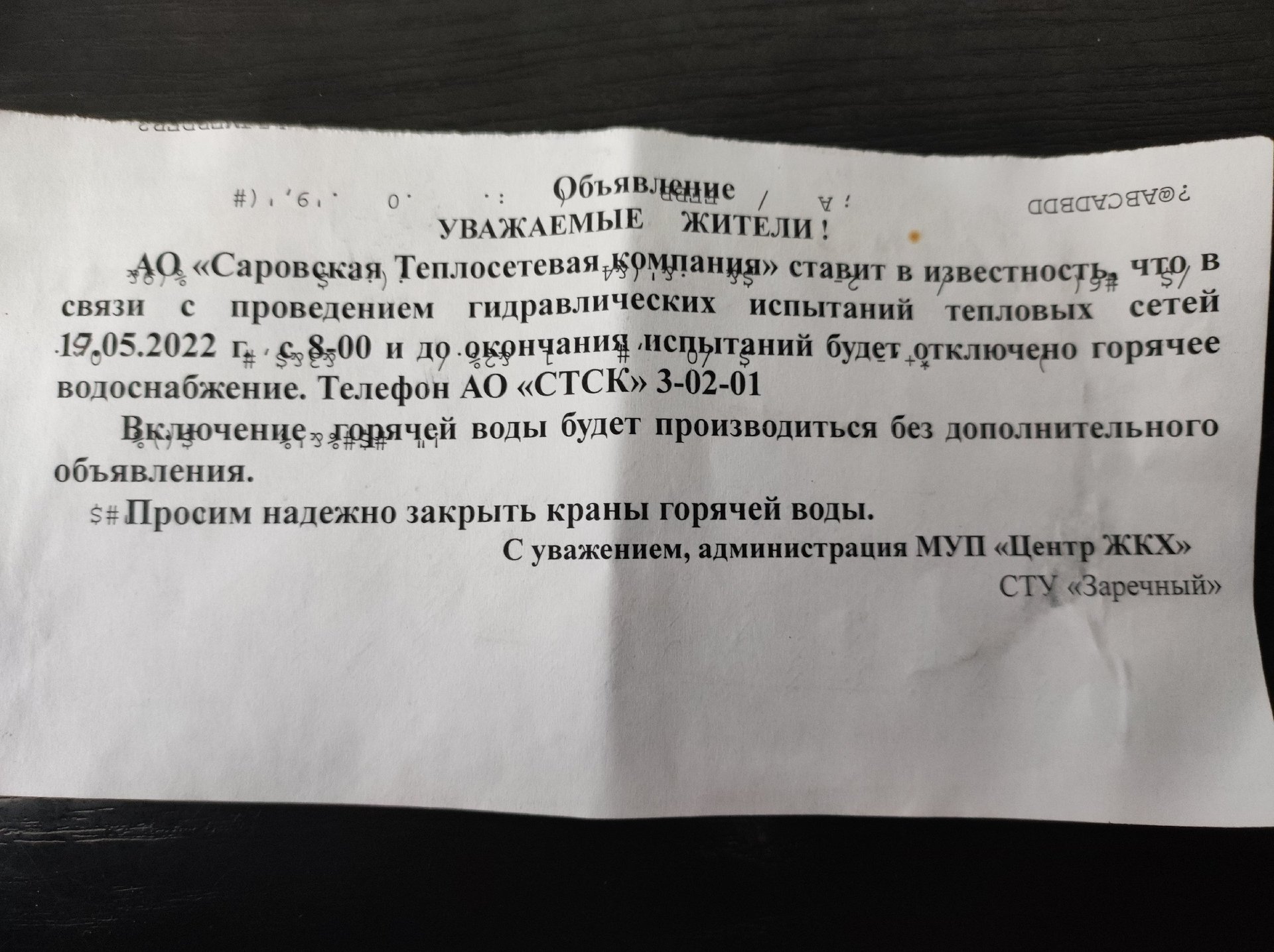 Напоминаем, что с сегодняшнего дня в Сарове будут проводить гидравлические испытания тепловых сетей и соответственно отключат горячую воду