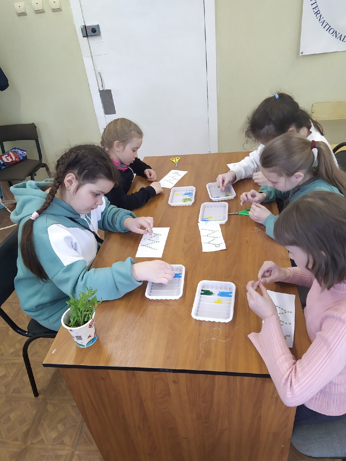 В начале занятия ребята узнали, куда именно они переместились из привычной мастерской и почему. Новая обстановка ребят ничуть не смутила, и они быстро принялись за дело. А дело было кропотливое. Из бисера ребята на выбор плели подвеску или браслет с незабудками, которые являются символом памятного дня. А по окончании сложной работы ребята с интересом устремлялись к нашей маленькой карте.