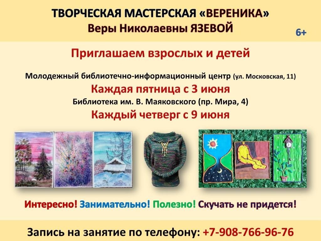 Творческая мастерская В.Н. Язевой и позволит узнать что-то новое, раскрыть свой талант. Встречи будут проходить каждый четверг в Центральной библиотеке (пр. Мира, 4) и каждую пятницу в Молодежном библиотечно-информационном центре (ул. Московская, 11).
