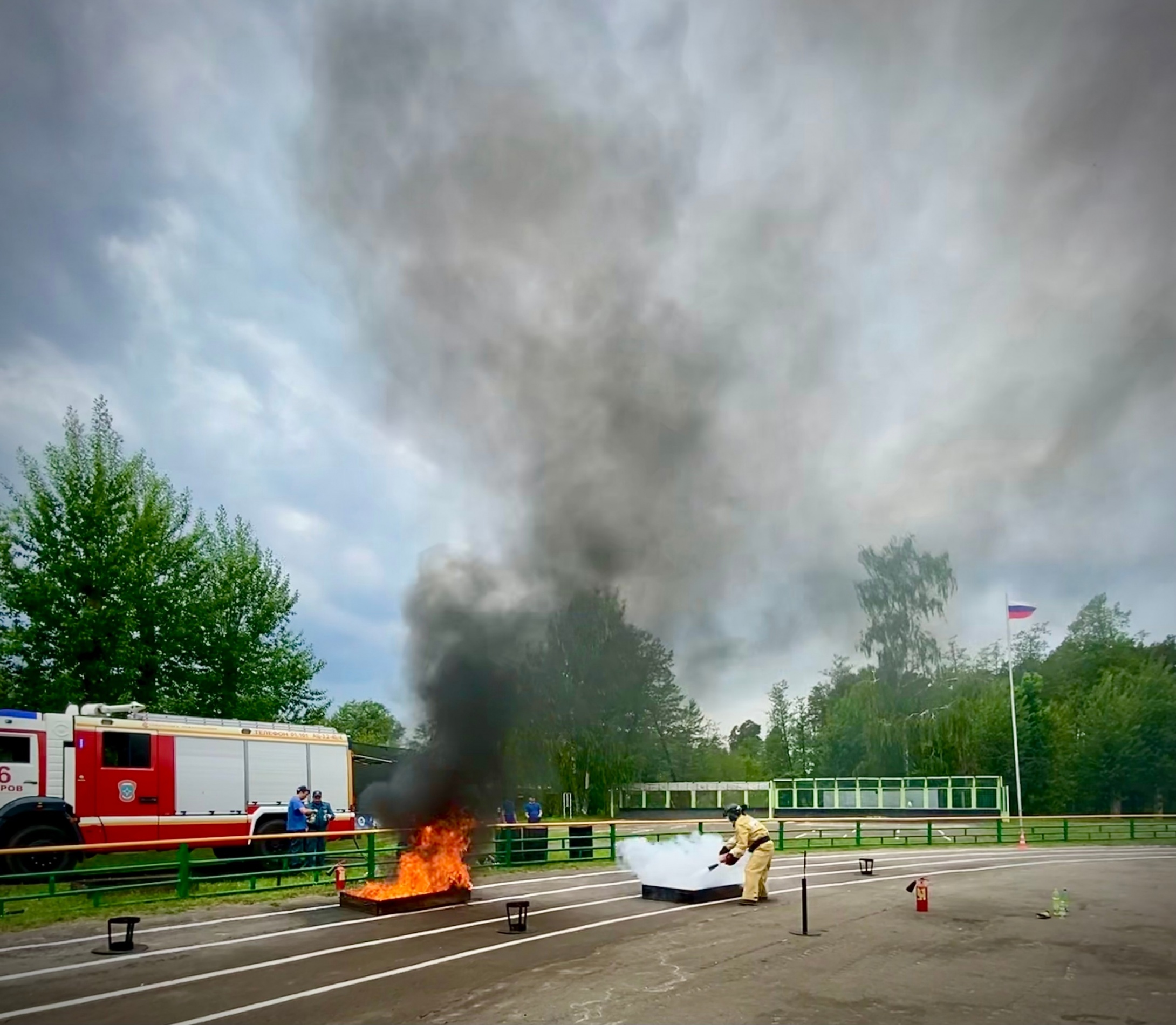 Практическая часть разделена на 4 этапа: прокладка рукавной линии от пожарного крана, тушение горящей жидкости в металлической бочке, ликвидация возгорания в противне с помощью огнетушителя и оказание помощи пострадавшему.