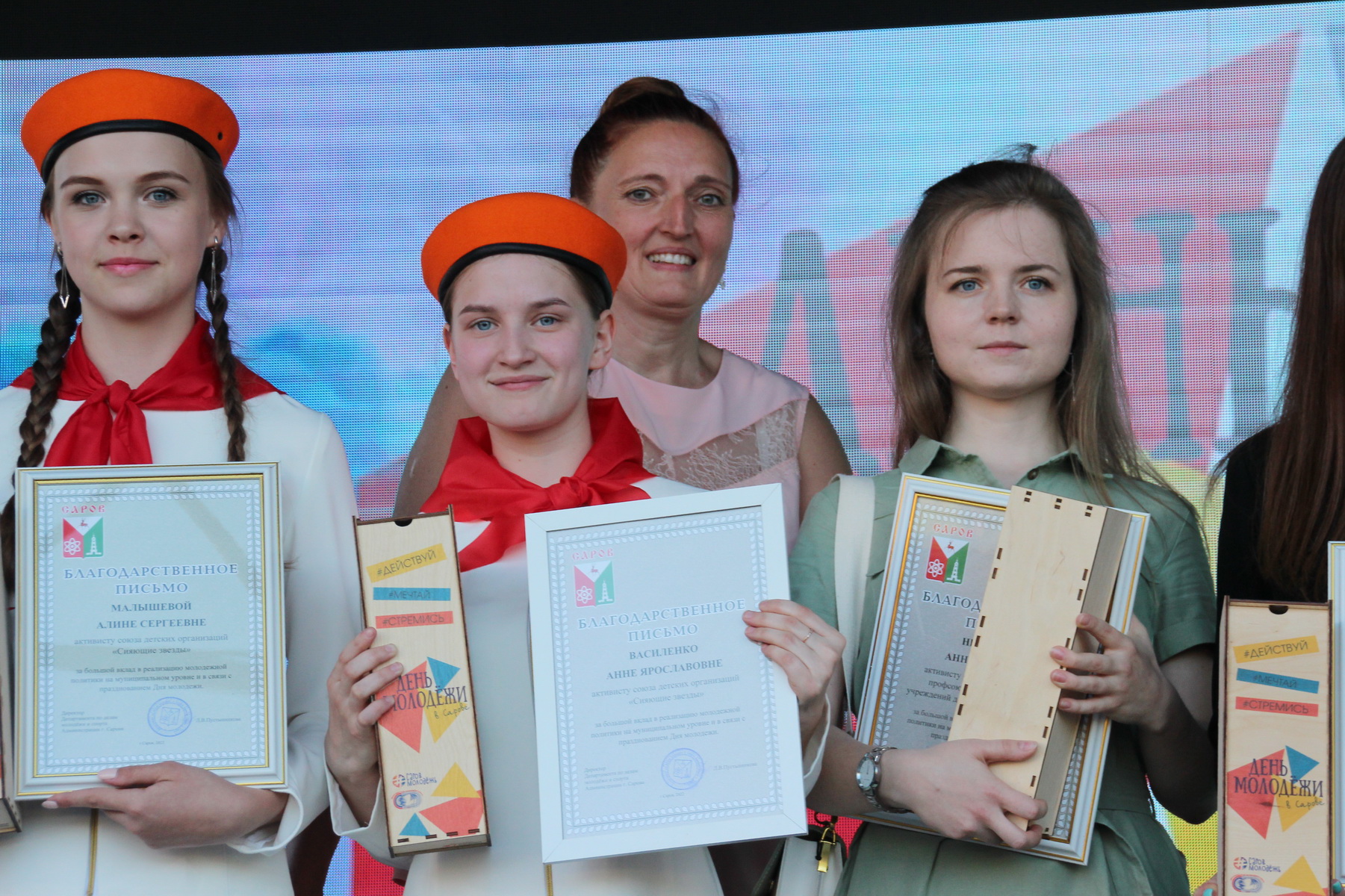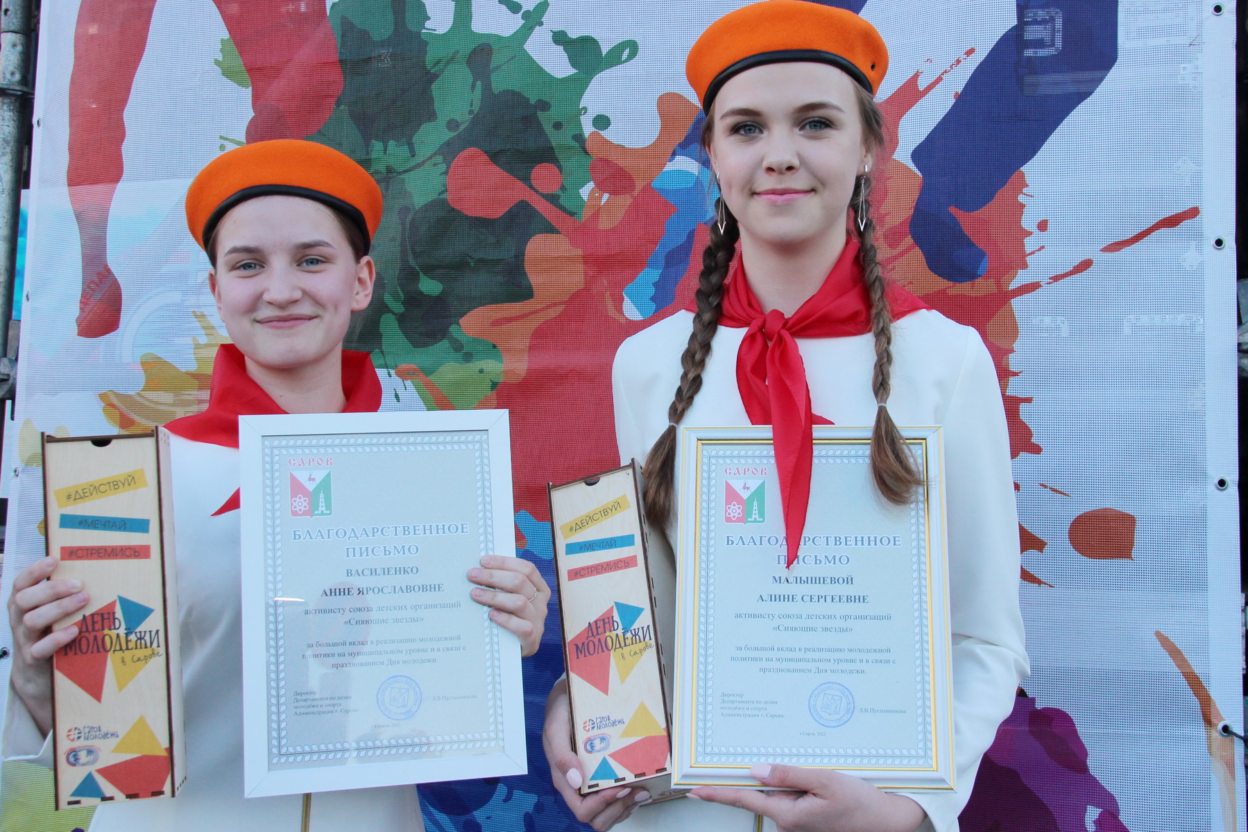 От союза детских организаций «Сияющие звезды» за большой вклад в реализацию молодежной политики на муниципальном уровне благодарственными письмами награждены пионеры-инструкторы, члены сводного отряда барабанщиков Анна Василенко и Алина Малышева.