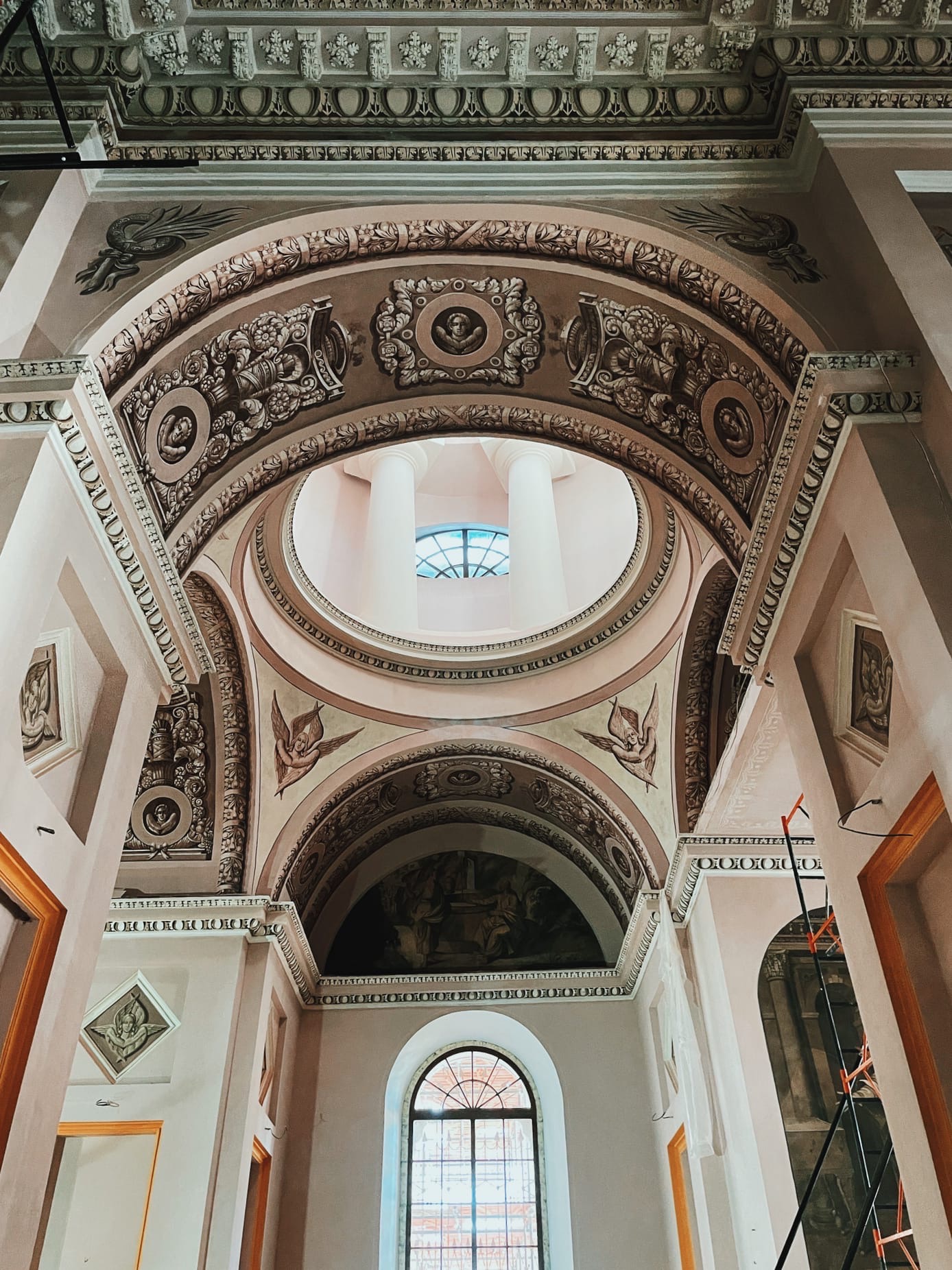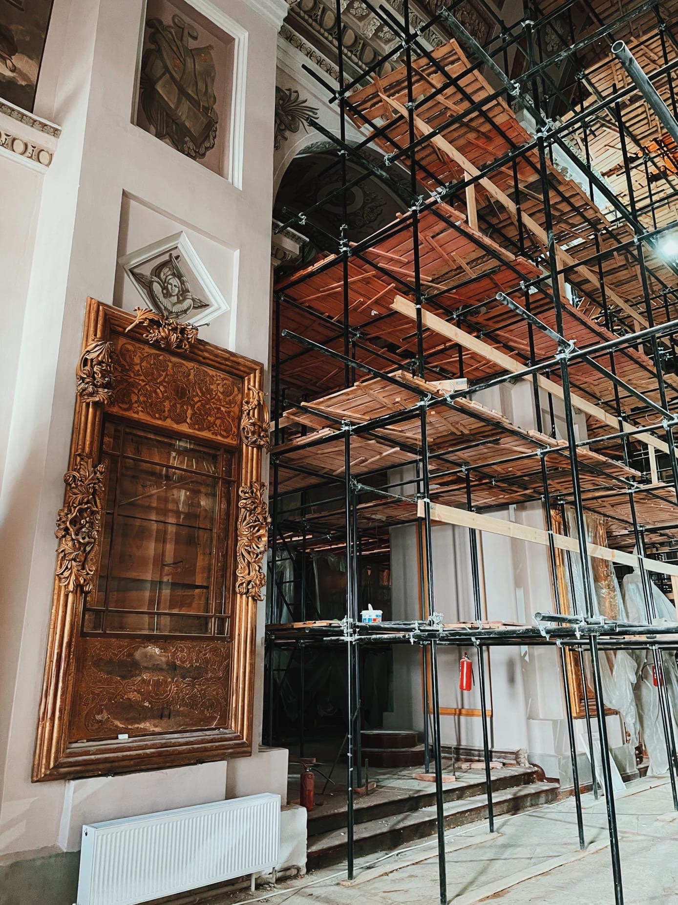 Сейчас восстанавливают живопись, исторический деревянный пол, фасады, лепнину колонн, лестницы, цоколь, реставрируют иконы и старинные предметы (восстановлено 90 из 207).