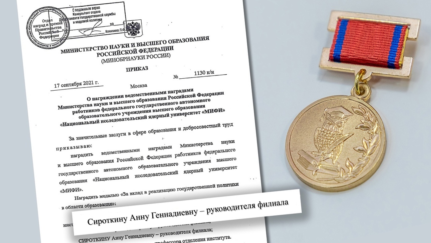 Ведомственная награда Министерства науки и высшего образования Российской Федерации за значительные заслуги в сфере образования и добросовестный труд была вручена Анне Геннадиевне Сироткиной на Ученом совете НИЯУ МИФИ, состоявшемся 6 июля 2022 года.