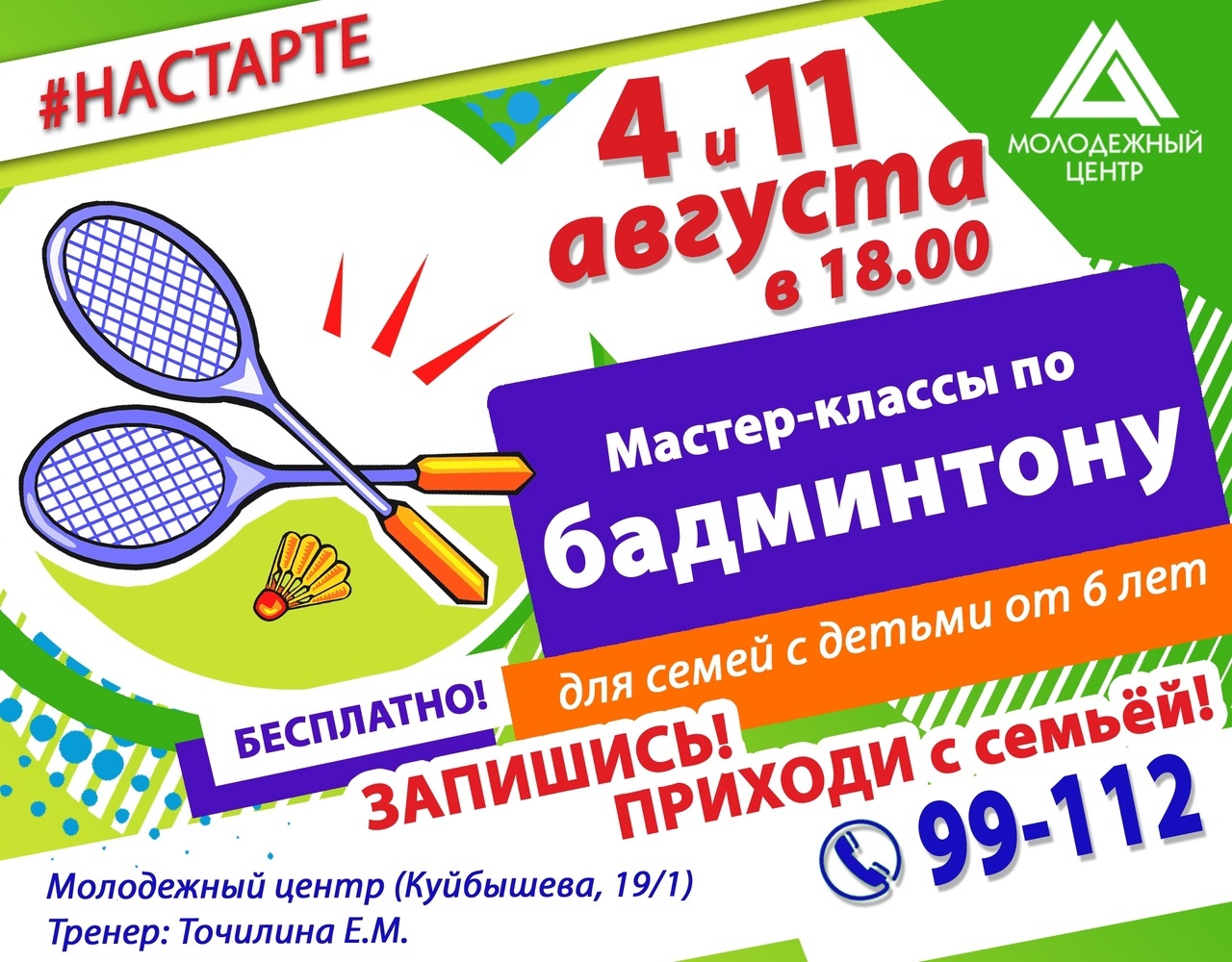 В этот и следующий четверг (4 и 11 августа) в 18.00 в Молодёжном центре пройдут мастер-классы по БАДМИНТОНУ в рамках проекта #НАСТАРТЕ для семей с детьми от 6 лет.
