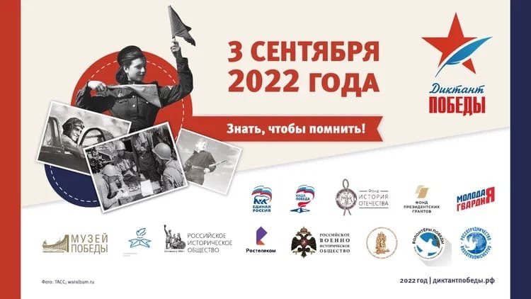 3 сентября 2022 года, в день окончания Второй Мировой войны, в России и за рубежом в четвертый раз состоится Международная патриотическая акция «Диктант Победы», организуемая постоянно действующим Организационным комитетом Партии «Единая Россия» «НАША ПОБЕДА» совместно с Российским историческим обществом, Российским военно-историческим обществом и Всероссийским общественным движением «Волонтеры Победы».