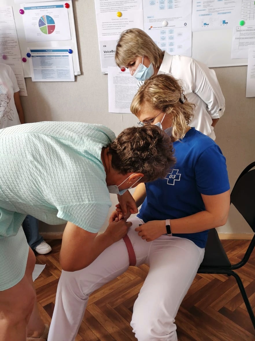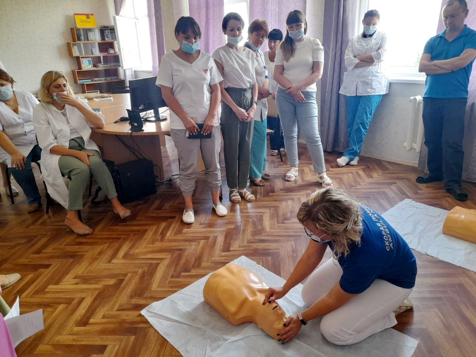 Практические занятия по базовой сердечно-легочной реанимации и оказанию экстренной помощи при кровотечениях провела и.о. заведующей отделением скорой медицинской помощи Елена Тришина для врачей и фельдшеров поликлиник.