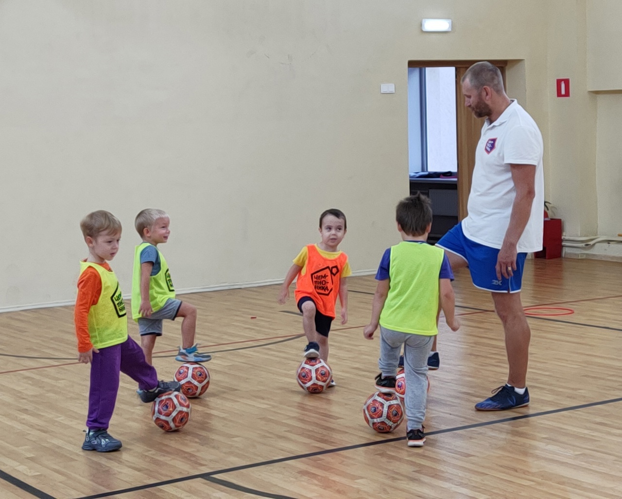 Совсем юные спортсмены с большим интересом выполняли задания тренера, узнавая о возможностях работы с мячом через игру. По очереди и вместе выполняли упражнения, не забывая, что вместе они — команда!