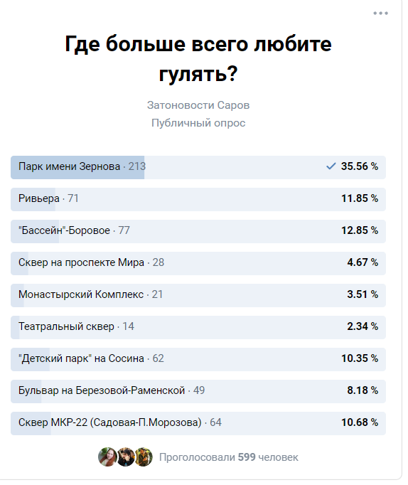 Мы часто пишем о благоустройстве в Сарове и о том, как общественные места в нашем городе меняются. А теперь решили выяснить, какое место для прогулок и отдыха любимое у вас. В опросе приняли участие 599 человек. Лидирует ПКиО им. Зернова, за него проголосовали 35%. 13% предпочитают пруд Боровой для прогулок. 12% любят гулять у Ривьеры. 11% любят сквер в МКР-22. 10% гуляют в парке на ул. Сосина. 8% предпочитают бульвар на Берёзовой-Раменской. 5% любят сквер на пр. Мира. 4% гуляют в Монастырском комплексе и 2% в театральном сквере.