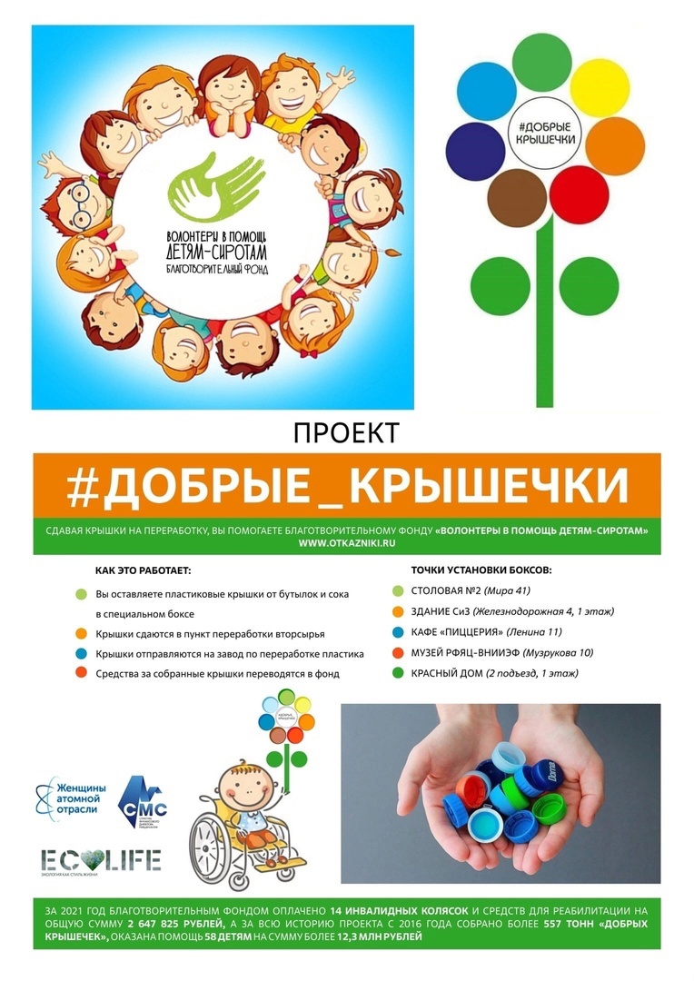 Амбассадор фонда поддержки и развития женских инициатив «Объединение женщин атомной отрасли» сотрудница РФЯЦ-ВНИИЭФ Анастасия Иванова организовала на предприятии экологический проект «Добрые крышечки». В пяти точках установлены боксы для сбора пластиковых крышек. Из этих контейнеров крышки будут отправляться в нижегородский пункт сбора, откуда — на завод по переработке.