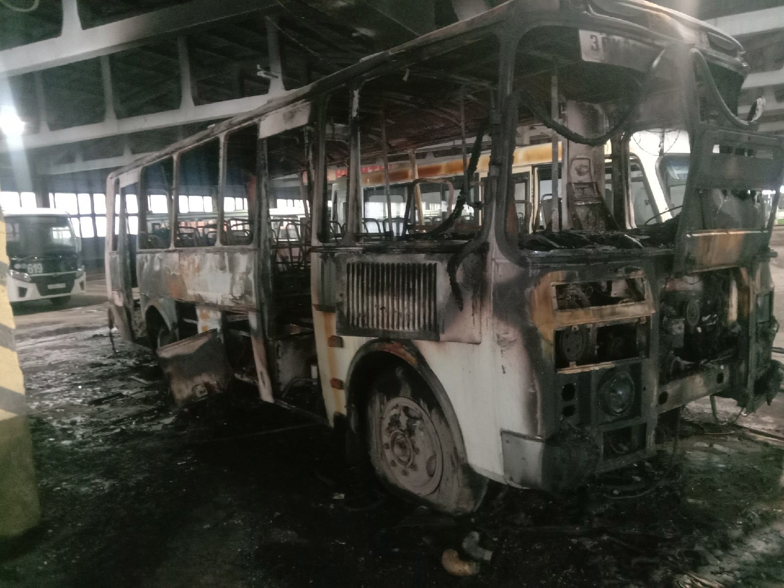 Автобусы, выполняющие перевозку пассажиров, также не пострадали. Но сильно покрылись копотью, поэтому были отправлены на повторную мойку, в том числе и салонов.