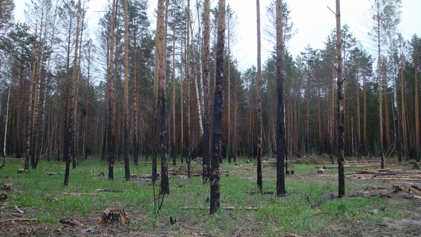 В прошлом году на указанном участке было возгорание леса (какие-то молодые люди во время пожаров и засухи решили пожарить шашлыки). Несмотря на то, что огонь удалось вовремя погасить, сосны не выдержали высокой температуры, кора обуглилась, а к осени на деревьях появился жук-короед.
