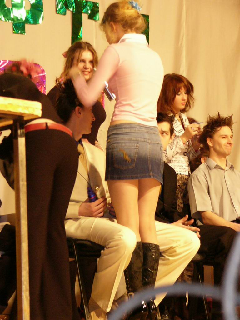 На первом плане причёску умопомрачительно наводит Алёна Давыдова, справа от неё на снимке Катя Торгашова, которую более выпукло мы увидим на других снимках