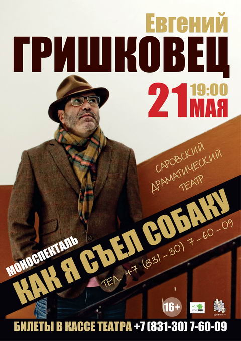 Первый и самый знаменитый моноспектакль Евгения Гришковца можно увидеть, купив билеты на «Как я съел собаку» в кассе Саровского драматического театра