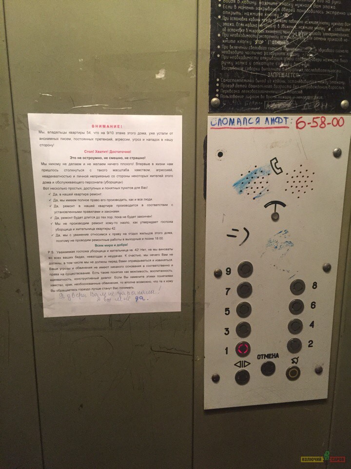 А вот на улице Гоголя, похоже, разгорается противостояние между жителями одного и того же дома вокруг ремонта, проводимого в квартире на девятом этаже. Сперва вроде бы жильцы-ремонтники начали побеждать, но тут противная сторона получила неожиданного союзника — уборщицу!