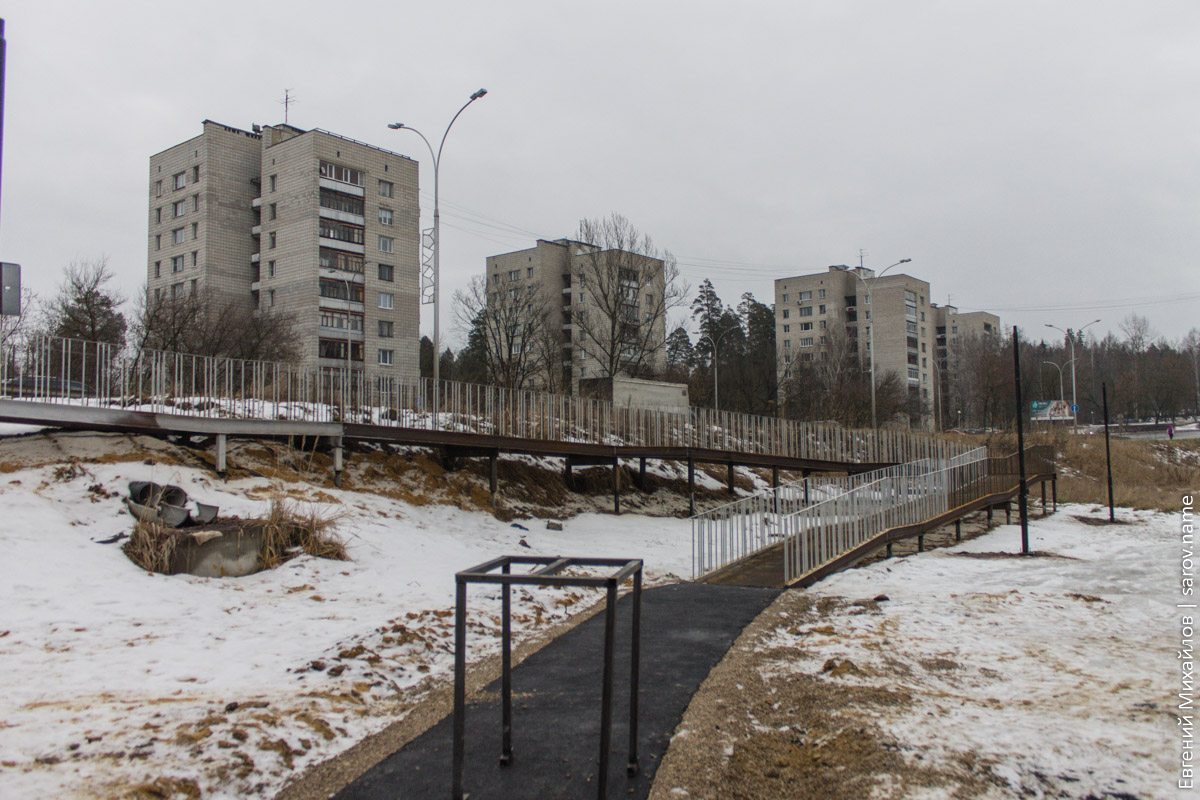 Несмотря на надпись на плакате, которая гласит, что окончание работ должно было быть 12 ноября, объект закончить не успели и впёрлись прямиком в зиму. Возле моста можно заценить продвижение строительства лестницы и пандуса: