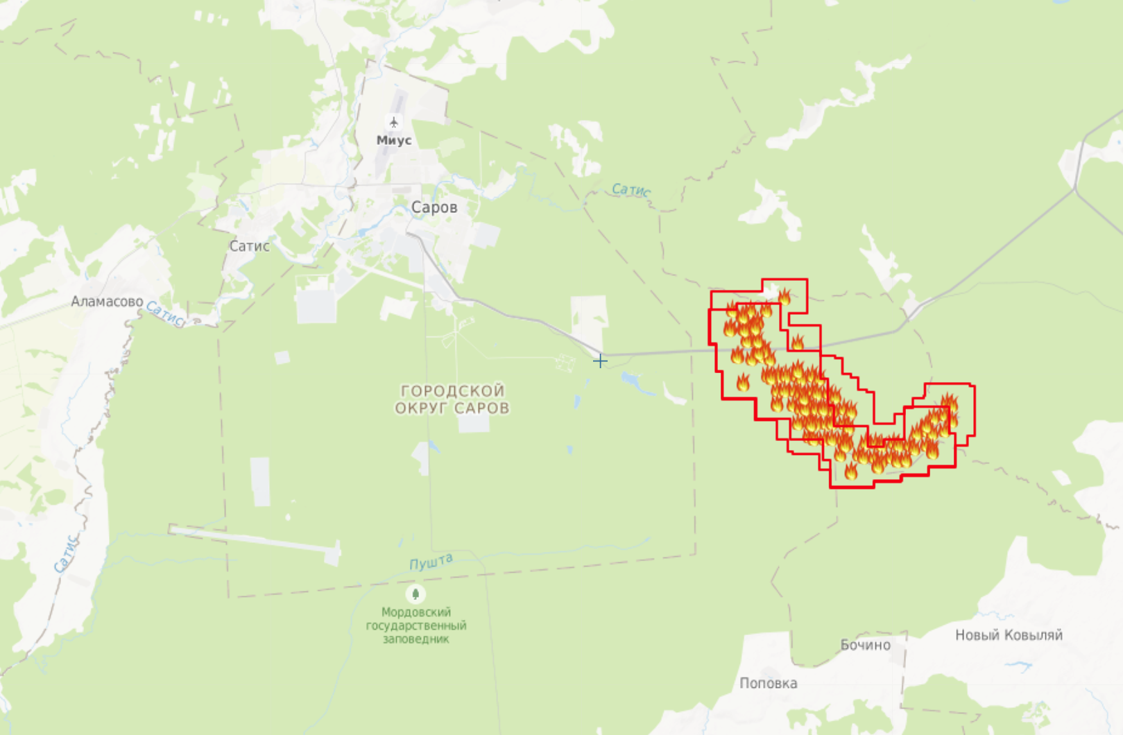 На востоке борьба продолжается. Двух крупных очагов больше нет, остался один, самый большой, который и слизнул посёлок Стеклянный, — он сейчас распространяется на юг и запад, то есть в сторону Сарова и основного лесного массива заповедника.