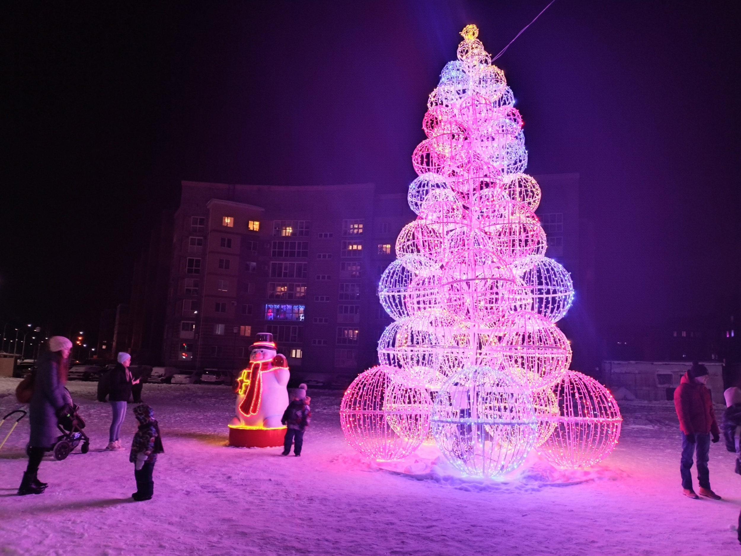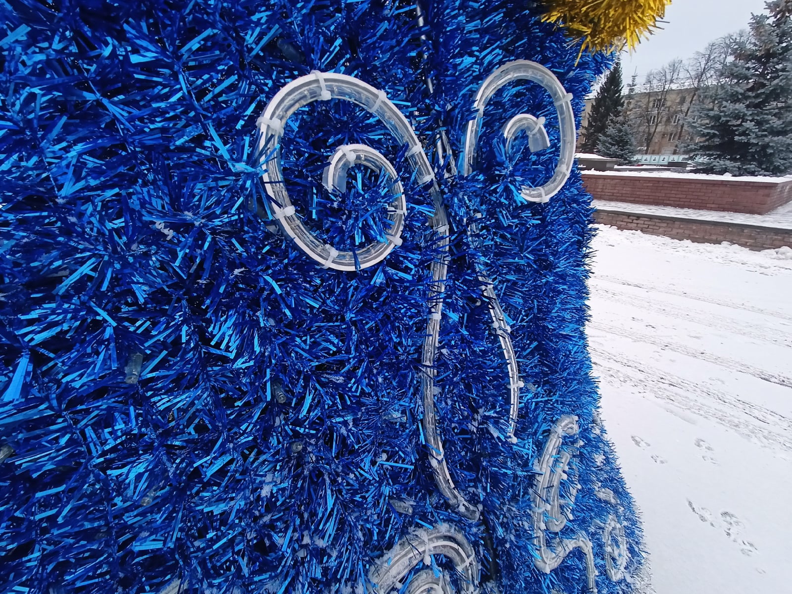 Переживали? Не переживайте. Старый фонтан традиционно украсили новогодней конструкцией «Северное сияние» (это светящиеся палочки на фото). Возле КБО на Курчатова, также традиционно, оформили пространство световым потолком — это лампочки на проводах, по типу сушилки для белья. А на углу «Раменская-Березовая» установили ёлку под кодовой кличкой «Лошарик».
