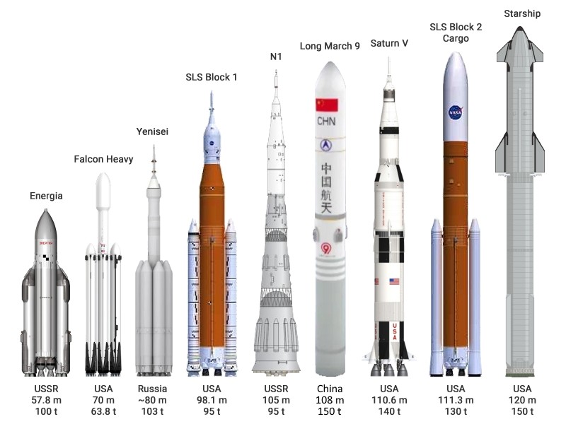 Ну и теперь у США есть две сверхтяжелые ракеты: Falcon Heavy поднимает 64 тонны на низкую орбиту, и SLS поднимает 95 тонн. Кроме того, в разработке находится монструозная до неприличия ракета SpaceX Starship/Super Heavy.