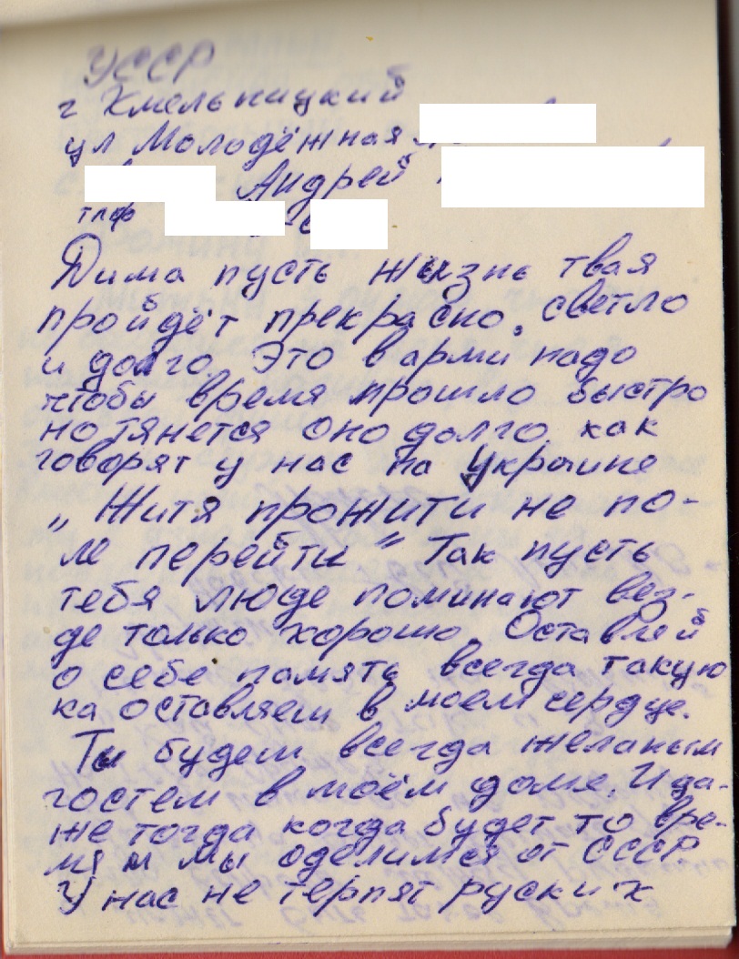 Перейду к тому, ради чего затеял этот пост: нашел у мамы давно забытый армейский блокнот, куда мне писали пожелания перед дембелем сослуживцы. Есть там и такая запись, датированная сентябрем 1989 года.