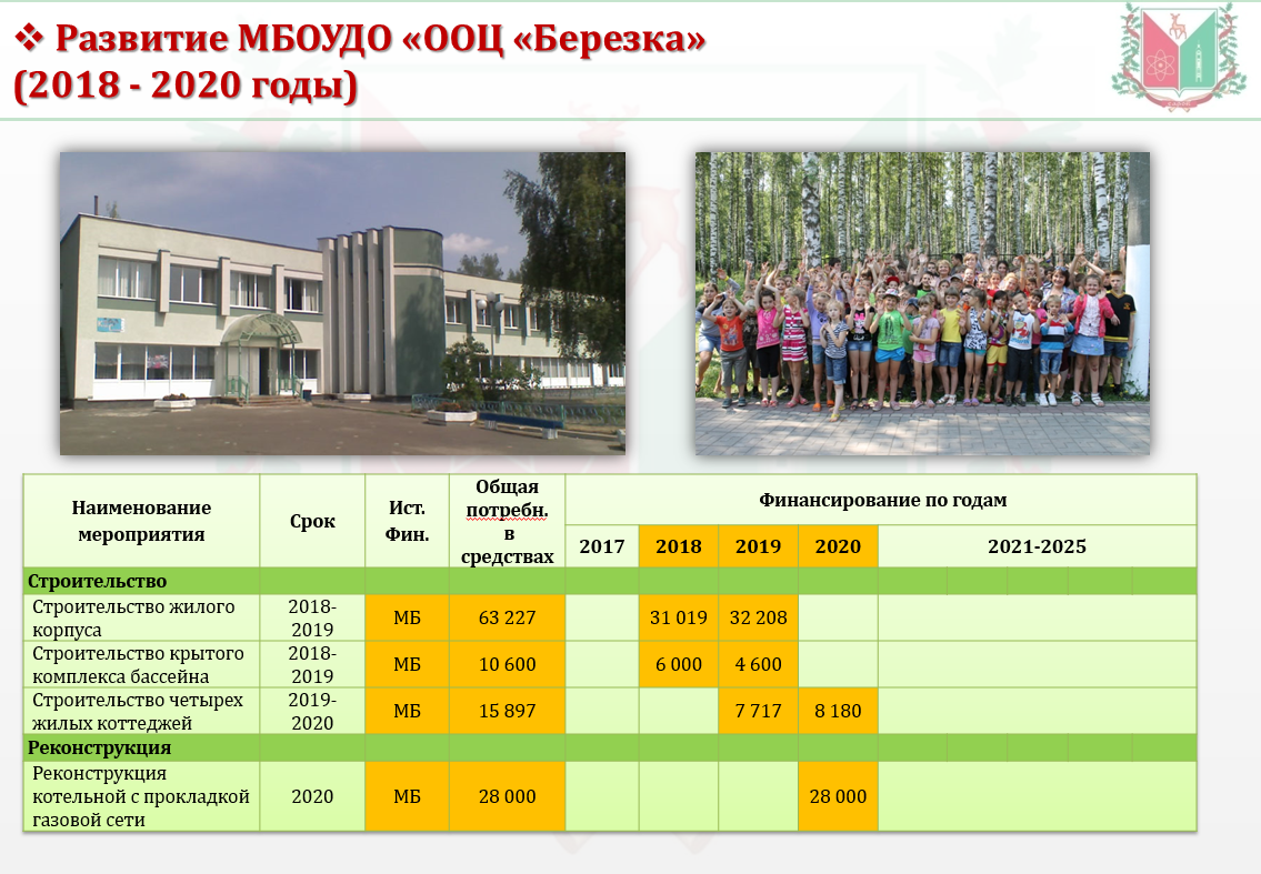 - новый жилой корпус, 4 коттеджа и крытый бассейн в лагере «Берёзка» к 2020 году;