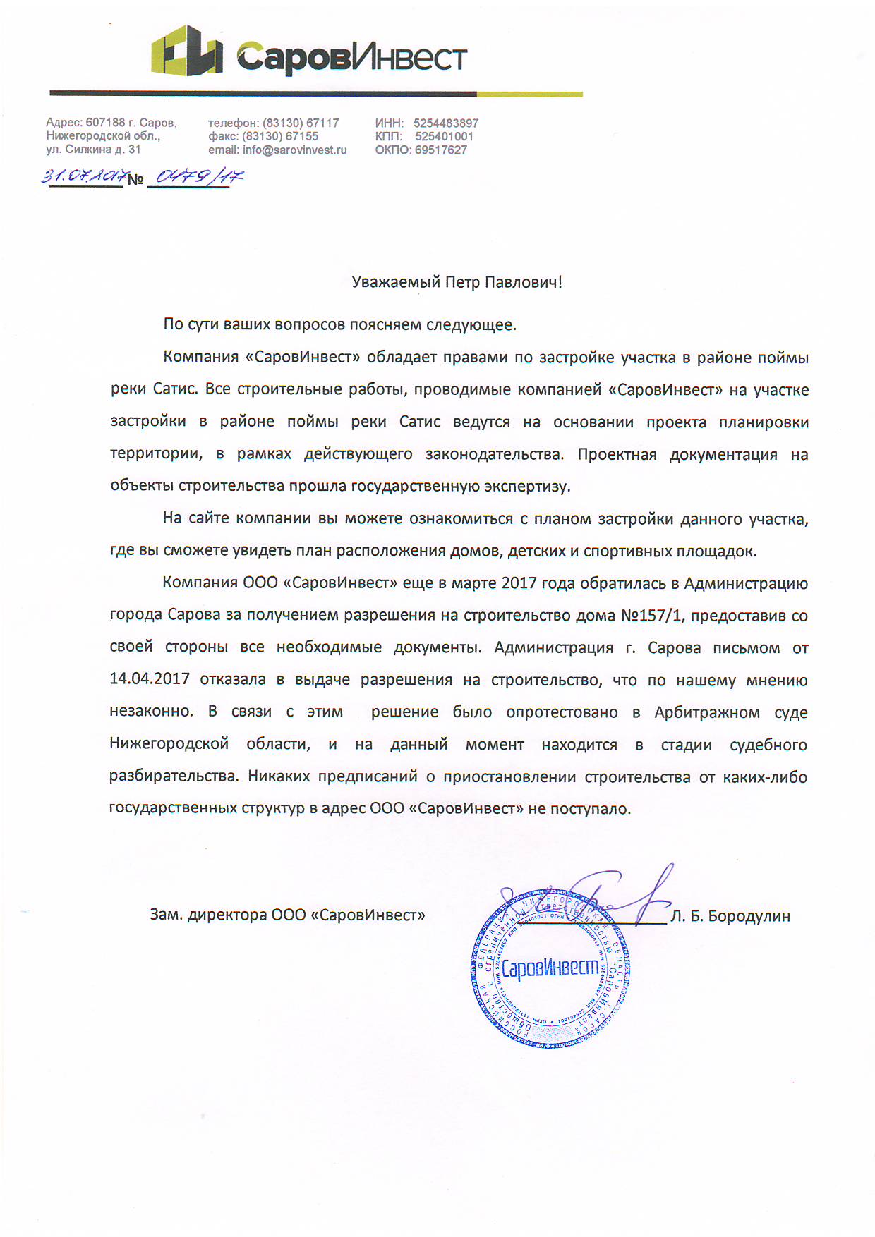 «Но до сих пор остается непонятным для меня и других депутатов, которым он адресован, почему СМИ не запросило интересующую их информацию напрямую у застройщика? Заинтересовавшись темой, я переадресовал не относящуюся к моим компетенциям часть запроса в адрес компании „СаровИнвест“…»