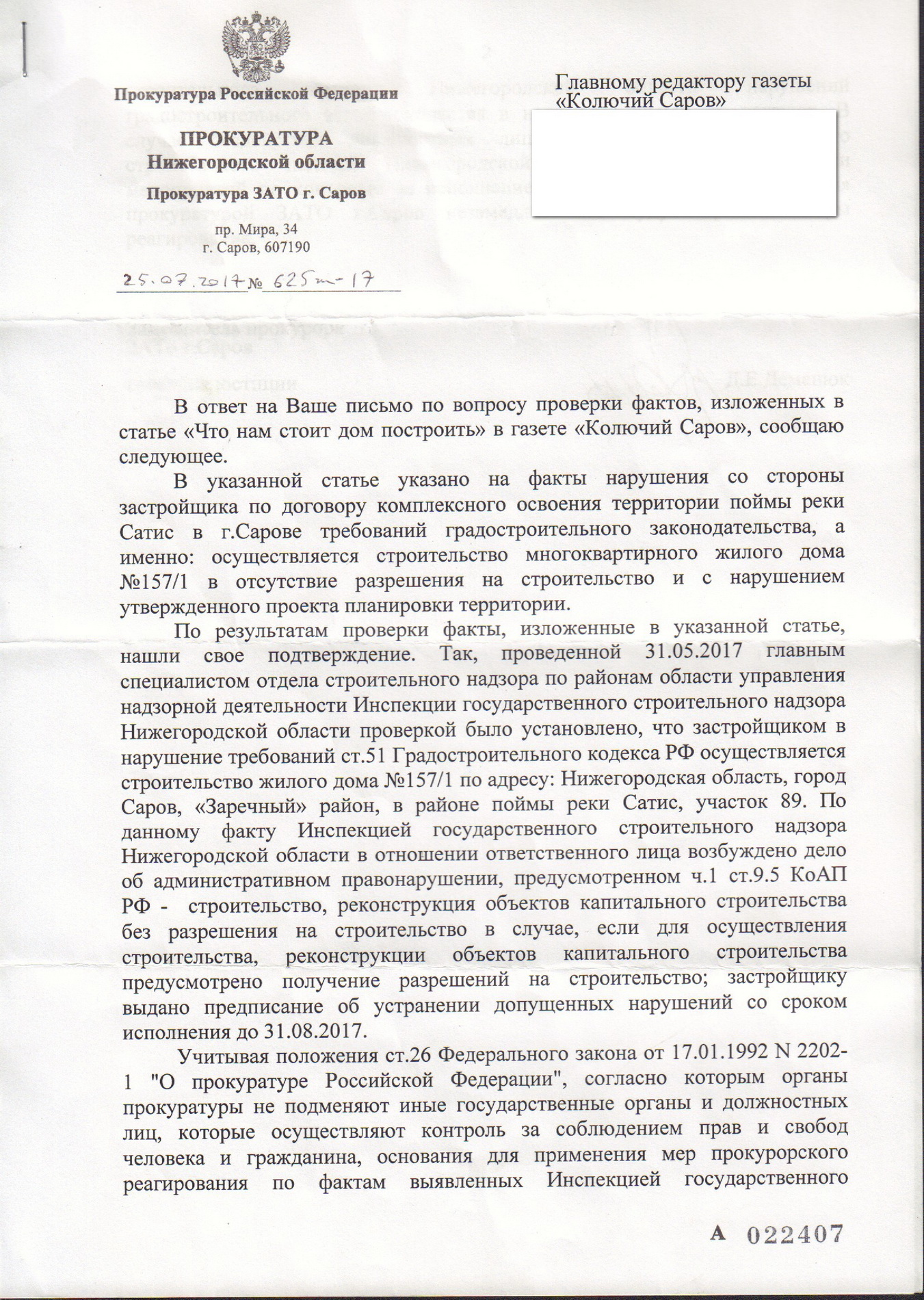 Прокуратура в свою очередь ответила, что в курсе того, что возбуждено дело об административном правонарушении, и если стройнадзор не будет принимать меры по контролю за исполнением предписаний, незамедлительно отреагирует: