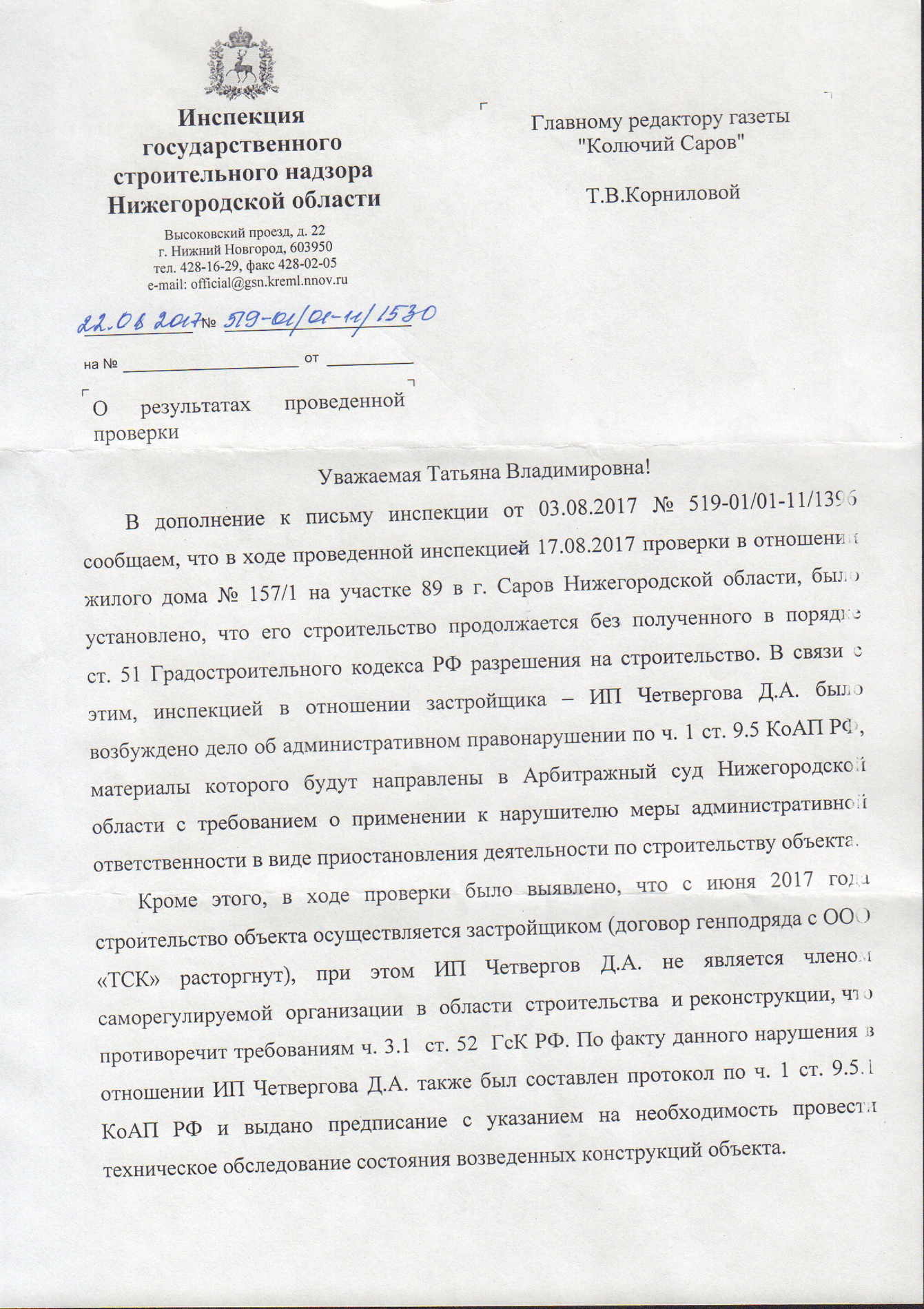 В-третьих, 17 августа инспекция государственного строительного надзора провела вторую проверку и убедилась, что незаконное строительство продолжается, возбудило ещё одно дело об административном правонарушении. Кроме того, обнаружились более вопиющие подробности. Строительство осуществляется индивидуальным предпринимателем Четверговым, который не имеет права заниматься строительством вообще, так как не является членом саморегулируемой организации в области строительства и реконструкции. Поэтому Стройнадзором выдано предписание провести техническое обследование уже построенных конструкций — ибо неясно, что мог настроить гражданин без права заниматься строительной деятельностью.
