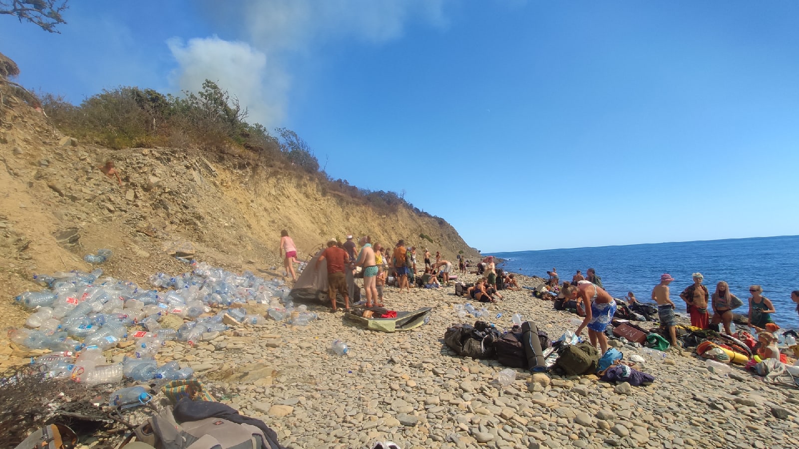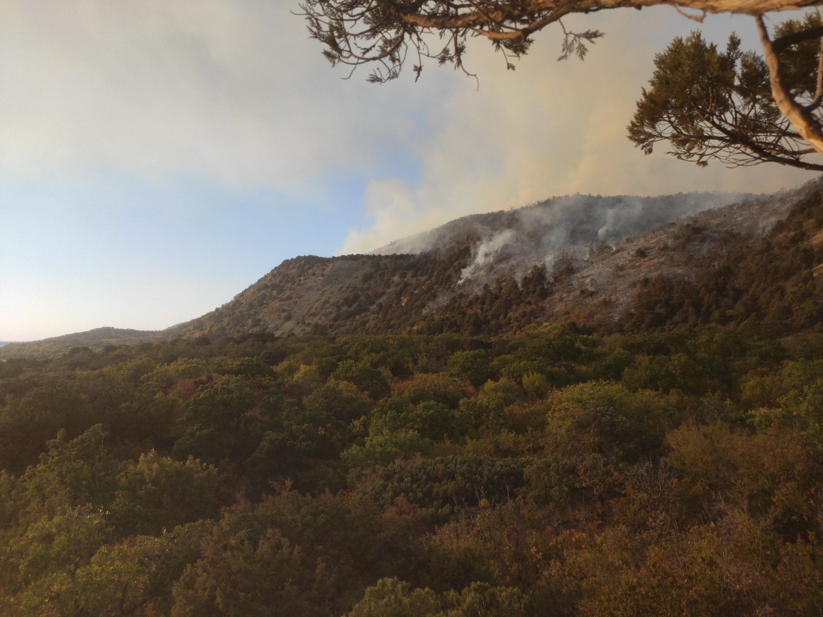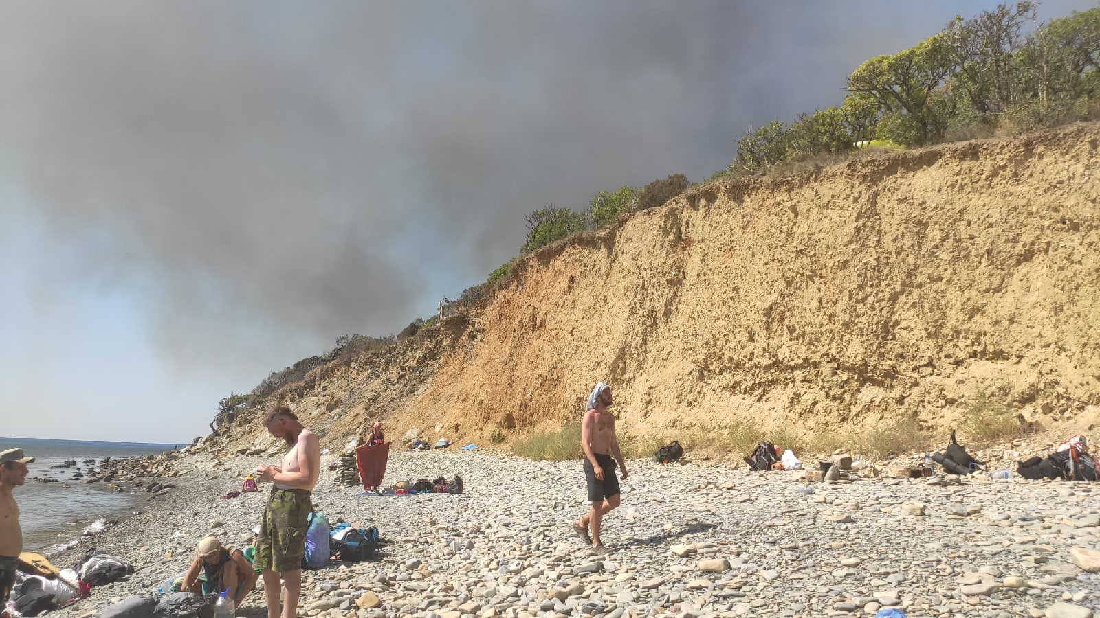 А наверху, где было возгорание, наши ребята тушили огонь водой, лопатами, палками, ногами — всем. Мы предполагали, что скоро прилетит вертолёт МЧС, пожарные как-то до нас доберутся. Но так получилось, что люди тушили пожар сами, без профессиональных пожарных, несколько часов. Вертолёт прилетел часов в 5 вечера. Он сделал несколько рейсов, забирая воду из моря и сбрасывая на очаги. Часа два он полетал, и всё — в 7 часов вертолета уже нет. Видимо, рабочий день закончился — так мы шутили.