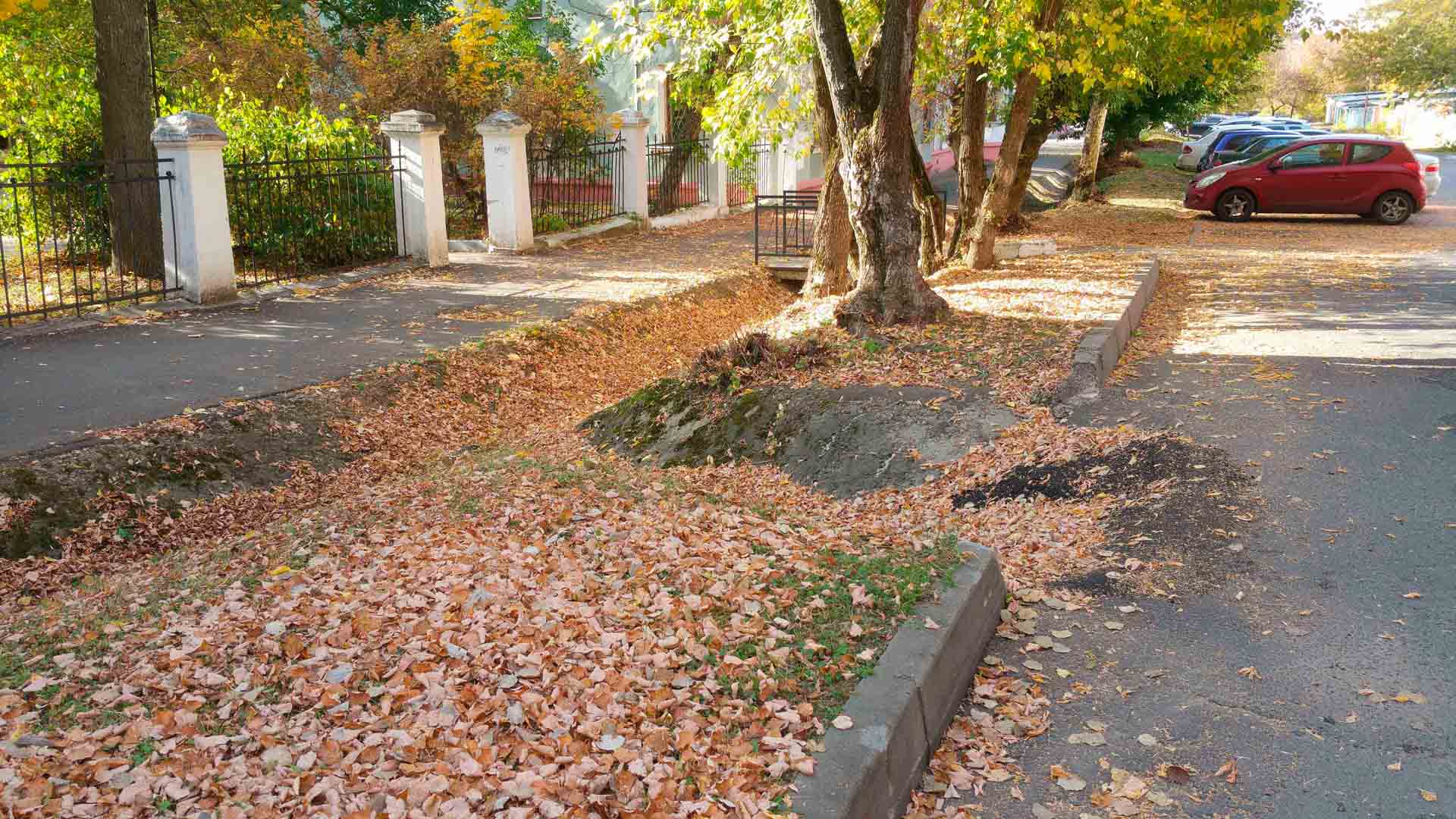 Шёл 2020-й год, мы выживали, как могли работы затихли сами собой. Вы всё ещё помните первую картинку? Думаете, что участок тротуара, пострадавший от размыва в 2013-м году, был восстановлен? Как бы не так — песочек зарос травой, всё стало густо-зелено, но криво и без бордюра: