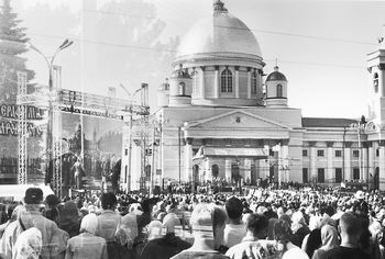 Торжества в Курске в честь 250-летия со дня рождения Серафима Саровского начались 20 июля. Прибытие мощей Преподобного ожидалось около полудня — их несли крестным ходом от аэропорта до Знаменского собора на центральной (Красной) площади Курска. В 16.00 должны были торжественно освятить часовню на месте родительского дома Преподобного около Сергиево-Казанского храма, где родители строили колокольню. У собора состоялась божественная литургия, которую народ на главной площади мог видеть на больших экранах внешней трансляции. Журналисты прибыли заблаговременно и получили пропуска на места главных событий. На вокзале в углу столик, за ним два священника — встречают гостей и паломников. Вход в пресс-центр докрашивают уже при прибывших журналистах; у входа — новенькая брусчатка. В пресс-центре говорят, что паломников пока (это утро первого дня праздника) всего около 4 тысяч. Впрочем, не все спешат занять места в палаточных лагерях: у храмов стоят стайки верующих, оттесненные плотными милицейскими кордонами, и поют акафист. По некоторым видно, что пришли они издалека и ждут с ночи. Особенно запомнилась бравая бабуся с клюкой, с увесистым мешком на спине и веселым белоголовым внучком лет десяти, которому она велела влезть ей на плечи, чтобы видеть, как освящают часовню на месте родительского дома Преподобного. Город весь заполнен оцеплениями стражей порядка; неподалеку от центрального собора в скверике у карусели отдыхают омоновцы… — Задержите женщину, предположительно в монашеском одеянии и в красных кроссовках, — раздается из рации милиционера, стоящего в оцеплении вокруг Красной площади. Площадь вдвое больше столичной, к тому же — с уклоном в сторону собора; три больших экрана теряются на ее просторах. В противоположном собору конце площади — двенадцать порталов металлопоиска, сейчас подхода к ним нет: крестный ход с мощами еще не прибыл. По сравнению с Городом меры безопасности приняты гораздо большие: только что был взрыв в Воронеже… — Нигде такого безобразия не было, — кричит в телефон администратор в пресс-центре, — никого из журналистов на площадь до сих пор не пускают! Им надо камеры устанавливать. Велено никого не пускать, пока все не пройдут и не проедут, а что тогда снимать? Дайте телефон начальника! Площадь оцеплена милицией с 6 утра, обставлена заграждениями, милиция стоит вдоль них с плотностью два милиционера на погонный метр. Центр оцеплен весь, жителей пропускают домой строго по документам, вокруг главных объектов праздника — второй кордон, гораздо более придирчивый. Людей пропускают на площадь через порталы металлопоиска, потом отдельно проверяют одежду металлоискателями. Изымают все колющие и режущие предметы. В мусорный мешок летят маникюрные ножницы, открывалки, пилки… Народ относится ко всему спокойно, не ропщет, просто проходит на площадь, терпеливо ждет дальше. Будет литургия, а потом допустят к батюшке. В просторном соборе густой розовый запах — невероятное количество белых роз; свежепоновленная, очень яркая роспись (здесь ближе к католическому Западу), собор заливает свет из широких южных окон и светового барабана. — Как мне быть-то, у меня гривны и доллары, поменять не успела, а образок Курской Коренной нужен — сокрушается паломница у свечного ящика. — Возьмите так, матушка. * * * Гуляем по городу. Све