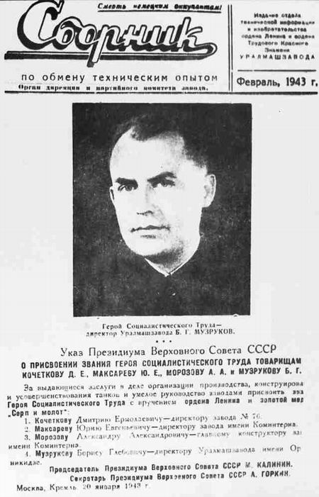 — В этот радостный час я с благодарностью думаю о коллективе уралмашевцев. Высокая правительственная награда обязывает меня лично отдавать все силы свои до конца, чтобы резко увеличился выпуск грозных боевых машин с маркой Уралмаша для нашей славной Красной Армии, которая ломает хребет ненавистному фашизму. Все силы отдам Родине!