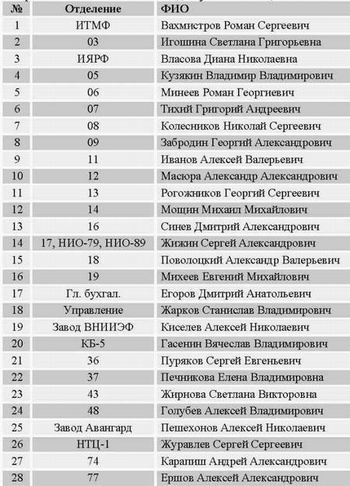 Ашмарин Александр (завод ВНИИЭФ), Горбунов Алексей (отделение 8 ИТМФ), Горькаев Дмитрий (отд. 19), Данилкин Павел (отд.5), Дарымов Владислав (отд.30), Ерошкин Сергей (КБ-3), Капинос Сергей (отд.16), Клементьева Татьяна (отд.72), Крыжко Станислав (отд.30), Кульков Александр (завод «Авангард»), Лисенков Андрей (ИЯРФ), Лобанова Юлия (ИЯРФ), Малышев Андрей (ИФВ), Муругов Станислав (ИЛФИ), Надежин Сергей (отд.1 ИТМФ), Нургалиева Ольга (отд.2017), Осипов Михаил (отделение 8 ИТМФ), Садовой Сергей (НТЦ-1) и Сивогривов Павел (отд.6).