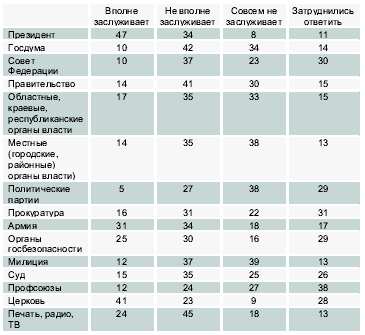 А если не «заграница»? Тогда придется воспользоваться результатами опроса, проведенного фондом «Левада-центр». Вопрос был задан так: «В какой мере, на Ваш взгляд, заслуживают доверия???» Ответы — в процентах — в таблице: