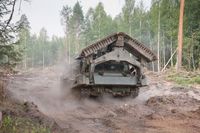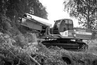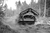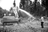 Здесь нам посчастливилось увидеть работы по минерализации воочию. Огромный путепрокладчик БАТ-2 расчищает просеки шириной до 100 метров. Он способен прокладывать полосы в лесистой местности, на косогорах, выкорчевывает пни, валит деревья, устраивает проходы в каменных завалах.