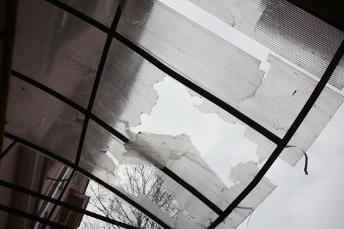Ни асфальта, ни игровой площадки, ни освещения, ни замены бордюров. Зато отсыревшие стены, облупившаяся штукатурка и — вот такие козырьки над подъездами (см. фото). И их точно не успели включить ни в какие программы. Жители, выходя из подъезда, по-прежнему задирают головы. Они боятся теперь не сосулек, а кусков пластика.