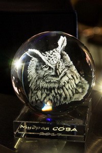 И почему: "Диплом победителя и кубок — стеклянный шар с изображением «Мудрой совы» — капитан сборной КБ-2 получил из рук Сергея Козинцева."?