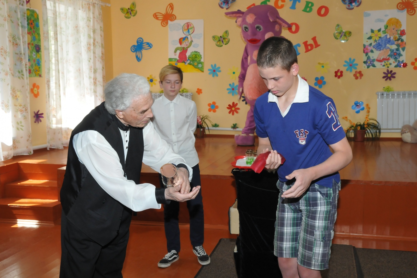А еще заводчане привезли развлекательную программу. Председатель профкома ЭМЗ «Авангард» Ирина Яковлева поздравила ребят с наступающим праздником Днем защиты детей. Веселая Веснушка напомнила о наступлении лета и загадала веселые загадки, затем все потанцевали вместе с любимым мультяшным героем Лунтиком и спели любимую и добрую детскую песенку про «Улыбку». Самой фееричной и волшебной частью праздника было выступление фокусника Ивана Александровича Жукова и его ученика Александра Шаронова, которое вызвало бурю восторга и у детей, и взрослых. Фокусники не просто показали ребятам чудеса, но и дали возможность принять в них непосредственное участие. Однако секреты фокусов так и не были раскрыты, хотя дети следили за волшебниками во все глаза.