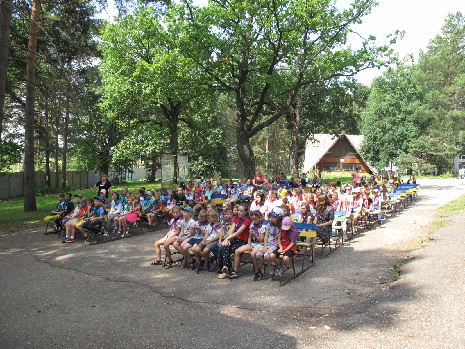 Торжественная линейка прошла энергично и весело: ребята представили свои отряды (их 11), вожатые представили свой отряд. Прозвучал гимн «Лесной поляны», над лагерем был поднят флаг.