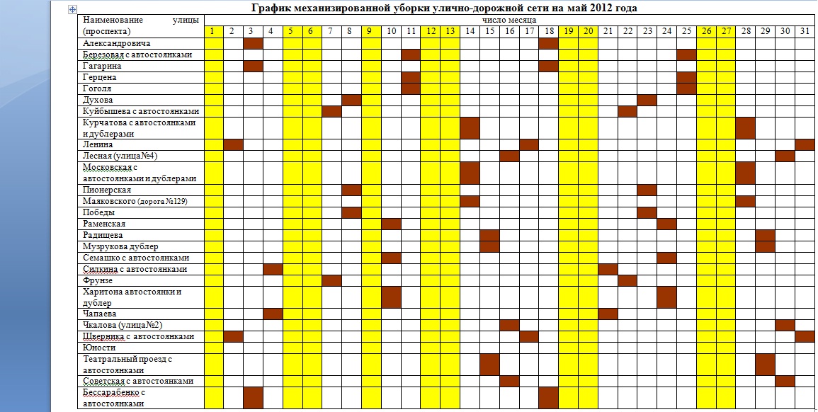В департамент городского хозяйства утвержден график механизированной уборки территорий, за которые отвечает Дорожно-эксплуатационное предприятие. Работы должны начинаться в 8−00, заканчиваться не ранее 17−00.
