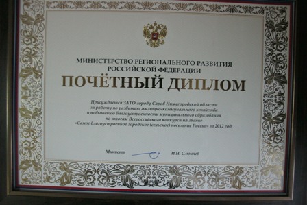 Три ЗАТО — Саров, Заречный и Трехгорный — отмечены во Всероссийском конкурсе на звание «Самое благоустроенное городское (сельское) поселение России» по итогам 2012 года. Торжественная церемония награждения с участием премьер-министра России Дмитрия Медведева и министра регионального развития Игоря Слюняева прошла в Москве 20 февраля. Об этом глава администрации Сарова Валерий Димитров рассказал 21 февраля на еженедельной встрече с журналистами саровских СМИ.