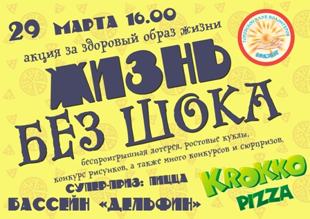 29 марта в 16.00 у бассейна «Дельфин» состоится акция «Жизнь без шока», направленная на пропаганду здорового образа жизни. В этот раз акцию клуба волонтеров «Инсайт» поддержала «Крокко-пицца».