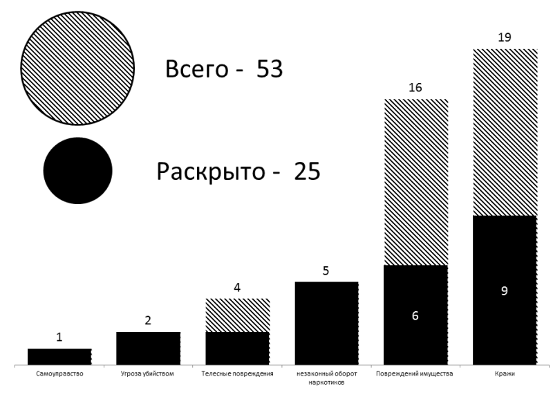 Зарегистрировано 53/25 обращения о происшествиях и преступлениях. Краж — 19/9, из автомобилей — 1/0, из гаражей — 1/0, в общественных местах — 9/9, прочих — 8/0. Незаконный оборот наркотиков — 5/5, самоуправств — 1/1. Телесных повреждений — 4/2, из них на бытовой почве — 1/1, из хулиганских побуждений — 3/1. Угроз убийством — 2/2. Повреждений имущества — 16/6, дорожно-транспортных происшествий — 50. Административных правонарушений — 826, из них нарушений паспортных правил — 4, в сфере безопасности движения — 635, в состоянии опьянения — 9. Мелких хулиганств — 11, появлений в общественных местах в пьяном виде — 48, за распитие спиртного в общественных местах — 85.