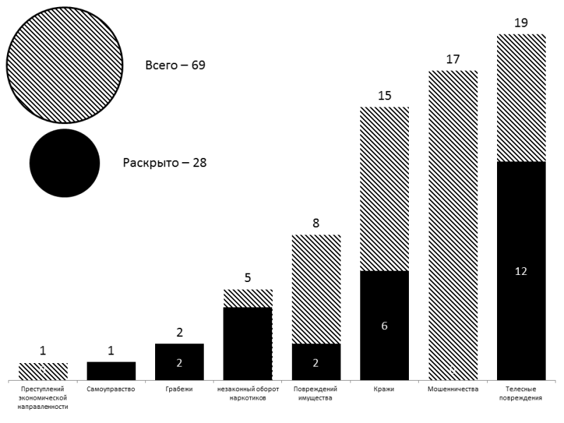Зарегистрировано — 69/25. Краж — 15/6, из квартир — 1/0, из автомашин — 1/0, с садовых участков — 2/1, в общественных местах — 4/4, прочих — 7/1. Грабежей — 2/2. Преступлений экономической направленности — 1/0, мошенничеств — 17/0, незаконный оборот наркотиков — 5/4. Самоуправств — 1/1.