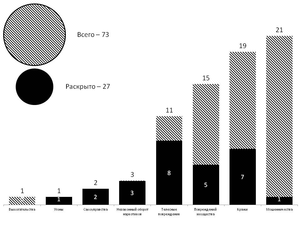 Зарегистрировано 74/27 обращения о происшествиях и преступлениях. Краж — 19/7, из квартир — 1/1, из гаражей — 1/0, с садовых участков — 3/0, из автомашин — 2/0, в общественных местах — 3/1, прочих — 9/5. Вымогательств — 1/0. Мошенничеств — 21/1, незаконного оборота наркотиков — 3/3, самоуправств — 2/2. Угонов — 1/1. Телесных повреждений — 11/8, из них на бытовой почве — 6/6, из хулиганских побуждений — 5/2. Суицидов — 1. Повреждений имущества — 15/5, дорожно-транспортных происшествий — 48. Административных правонарушений — 594, из них нарушений паспортных правил — 5, в сфере безопасности движения — 442, в состоянии опьянения — 4. Мелких хулиганств — 4, появлений в общественных местах в пьяном виде — 42, за распитие спиртного в общественных местах — 55.